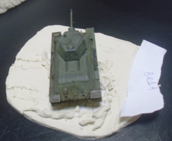 Только написал предыдущее сообщение - все свалили. Не знаю, должны ли были катки и гусеницы крутиться-вращаться, но "заказчик" всё, кроме башни и пушки, зафиксировал суперклеем. Пришлось помучиться. Вот такое получилось. Барьер, там где будет вода, потом вровень срежу. Впереди двое суток выходных - не знаю как усохнет. Танк снимать не буду, пусть усыхает с ним вместе.