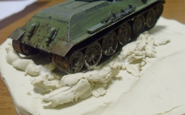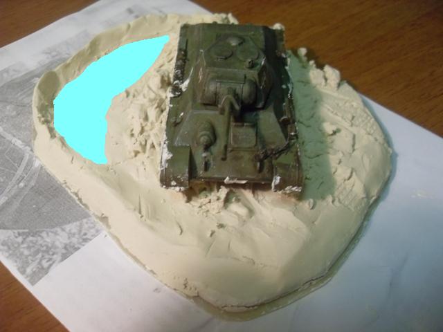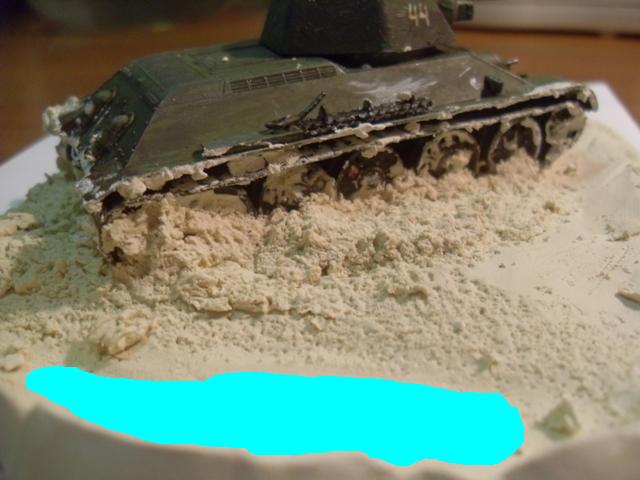 пока не высохло возьми щетинистую кисть и по тыкай чтоб рельеф песочка или земли был и приравняй...а лишнее сними... с танка... У тебя похоже больше на зимнюю грязь когда слякоть и тд...