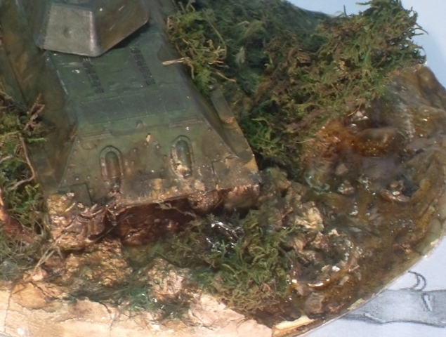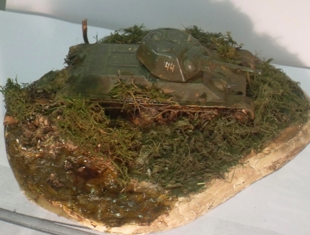 Ну чтож, мою идею не поддержали, пришлось думать самому! Вот закончил. Трава - лен, деревце - корешки какого-то растения и мох. Вода - смесь прозрачного клея и клей-геля "Момент" с добавлением коричневой краски.( твАрил на работе, а воду здесь больше нечем имитировать)Название:"Танки-панки грязи не боятся!"