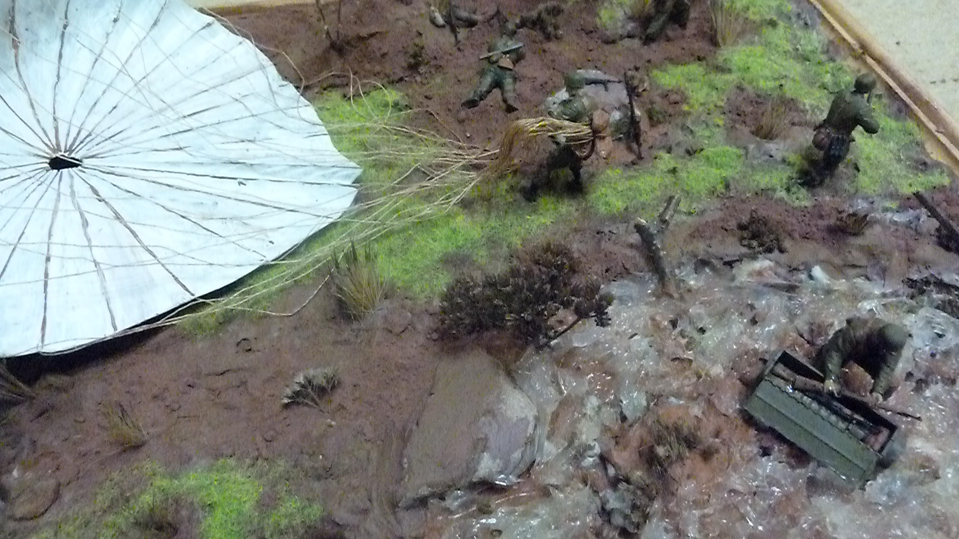 В работе представлен набор фирмы ЗВЕЗДА. (пришлось повозиться с парашютом) основание окрашенный гипс, трава фирма ЗВЕЗДА, ручей герметик прозрачный, деревья обычная трава (можно найти в лесу) высокая трава - кисть. Красил всё Звездовскими красками.(ни ка не могу снять фигуры без блеска).