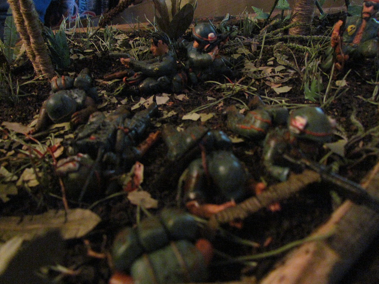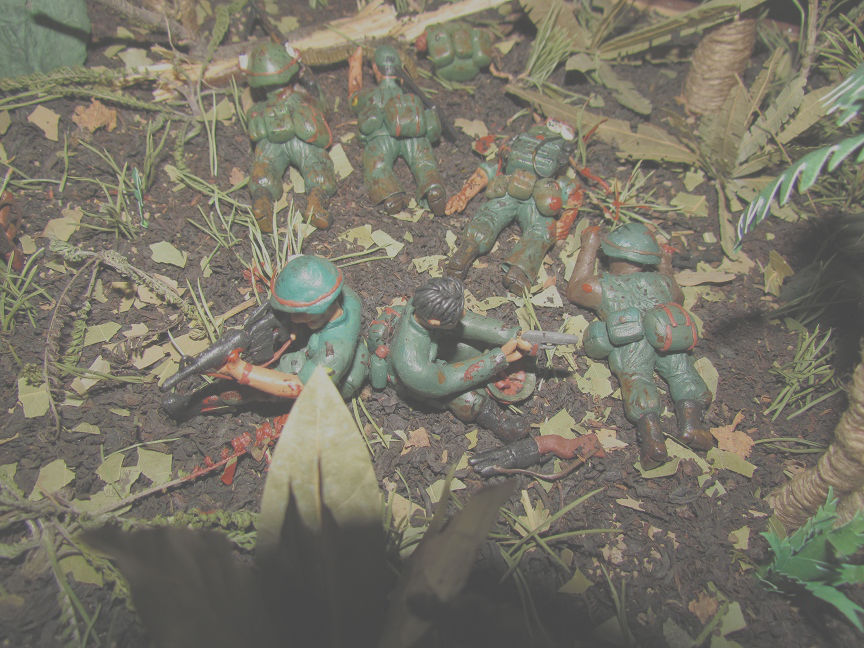 Лепил просто из обычного детского пластилина. Основание сделано из пластинок ДСП, засыпал чёрным чаем, лаврушкой, сухой листвой, немного мха. Пальмы из мешочных ниток. На создание диорамы толкнул фильм " Мы были солдатами"Сюжет: Дождь, грязь, назойливые насекомые, усталость, дырявые сапоги. Идёт взвод "Американских мальчиков" и штатов Техас, Канзас, курят,смеются разговаривают. И тут выстрел... Билли упал замертво, и сразу автоматные очереди со всех сторон, крики Вьетнамцев, взрывы, обстрел такой, что невозможно поднять голову. Все разом упали в грязь, казнив при этом своё оружие. Командир понимает, что взводу приходит конец, взвод окружён. При детальном рассмотре диорамы, становится ясно, что действительно, приблизительно через 5 минут, не останется никого...