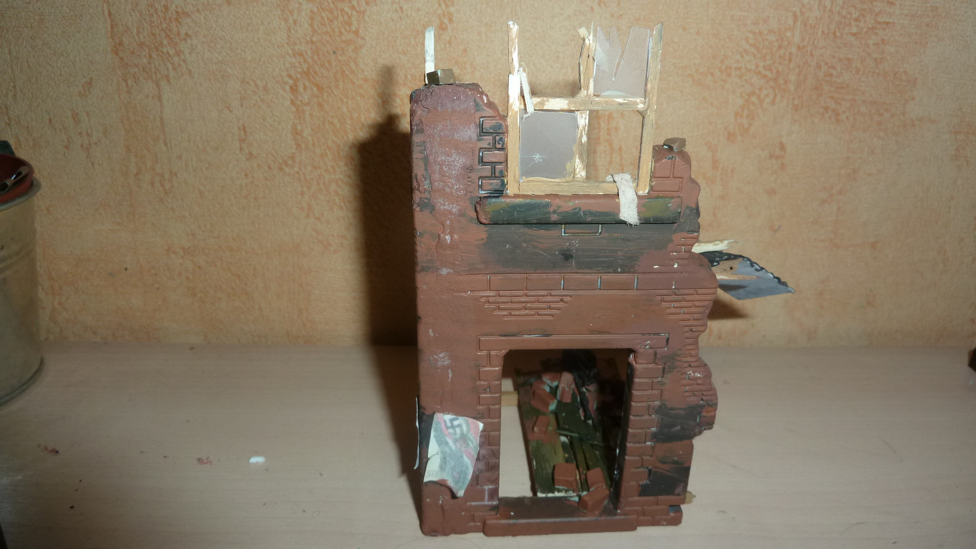 1)Здание делал сам. Откопал в свои пластмассовых солдатиков различные строения.Заполнил пустоты во внешний стороне гипсом. Перекрытие из обломков линейки. Листы железа обычный картон в разрезе окрашенный в чёрный цвет(добавил пигмент ржавчины) Рамы,полы из соломки, продают в книжных магазинах (соломки в наборе нужны для постройки различных изб,церквей и.т.д., но их можно использовать и в других целях,настоящий подарок для моделиста). Кирпичи изготовил из детской глины,окрасил. Тряпки, туалетная бумага смоченная в воде с пва.Стёкла тоненькое орк-стикло,встречается в подарочных магазинов это различные упаковки ёлочных игрушек и прочего (осколки нарезал просто на мелкие кусочки)Плакаты прост распечатал на принтере (маленько состарил).