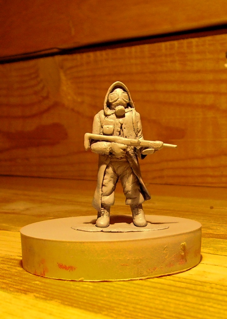 После того, как я поиграл в игру метро 2033, мне захотелось сделать фигурку по этой игре. Так как под рукой не было термопластики, то я начал делать фигурку из эпоксилина. Эпоксилин, впрочем, лучше термопластики по прочности. По крайней мере, я лепил все остальные работы из детской термопластики, поэтому фигурка из эпоксилина получилась тверже и крепче. Фигурка каркасная. Сделана полностью из эпоксилина. Оружие рюкзак тоже пришлось лепить из эпоксилина. Работа не покрашена. Эта тема, что-то вроде скульптуры.То есть фигурка сделана, но не покрашена. Подставка уже сделана, но фигурка не закреплина на ней.