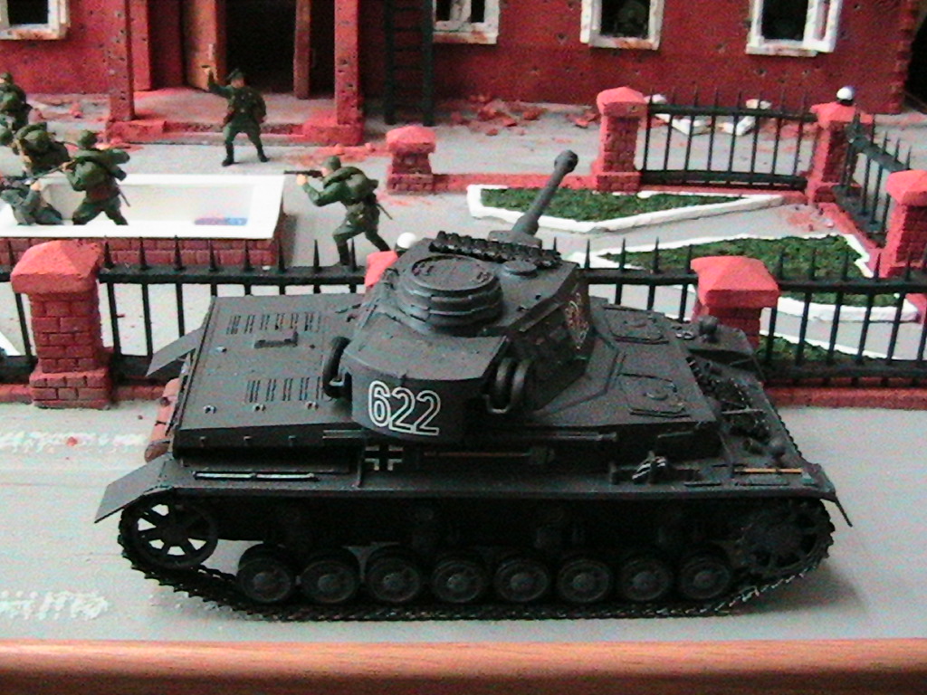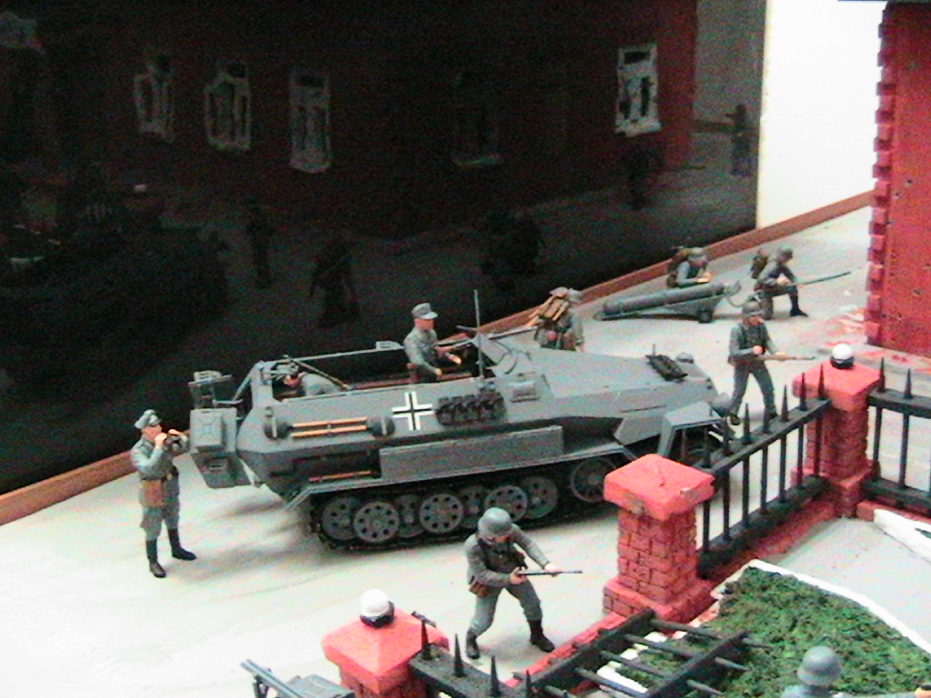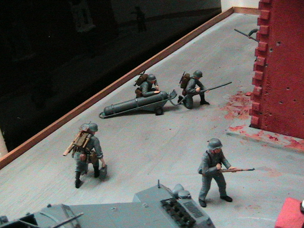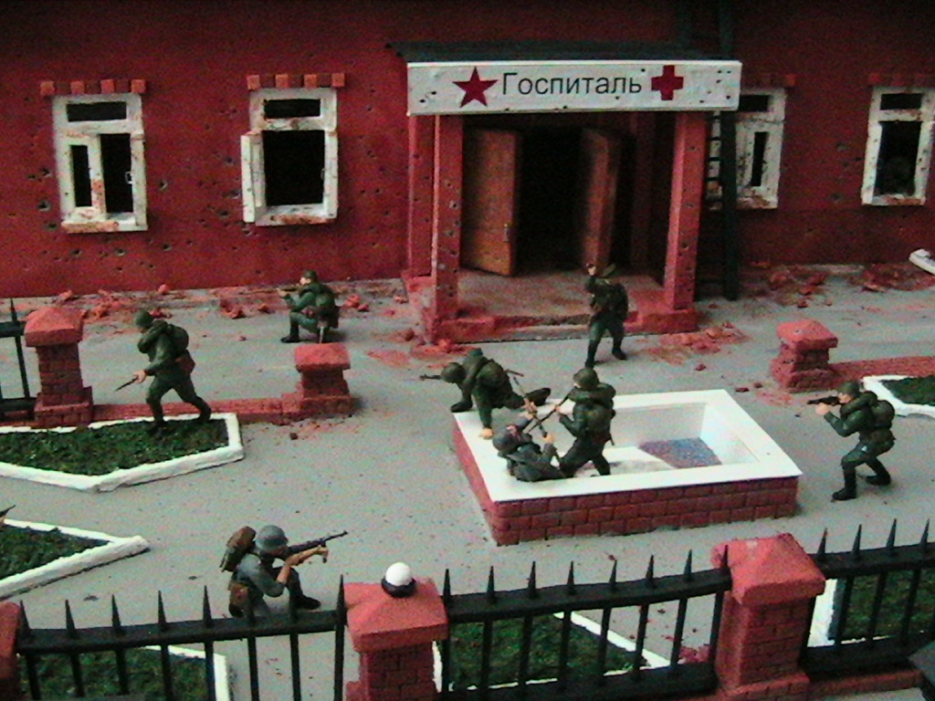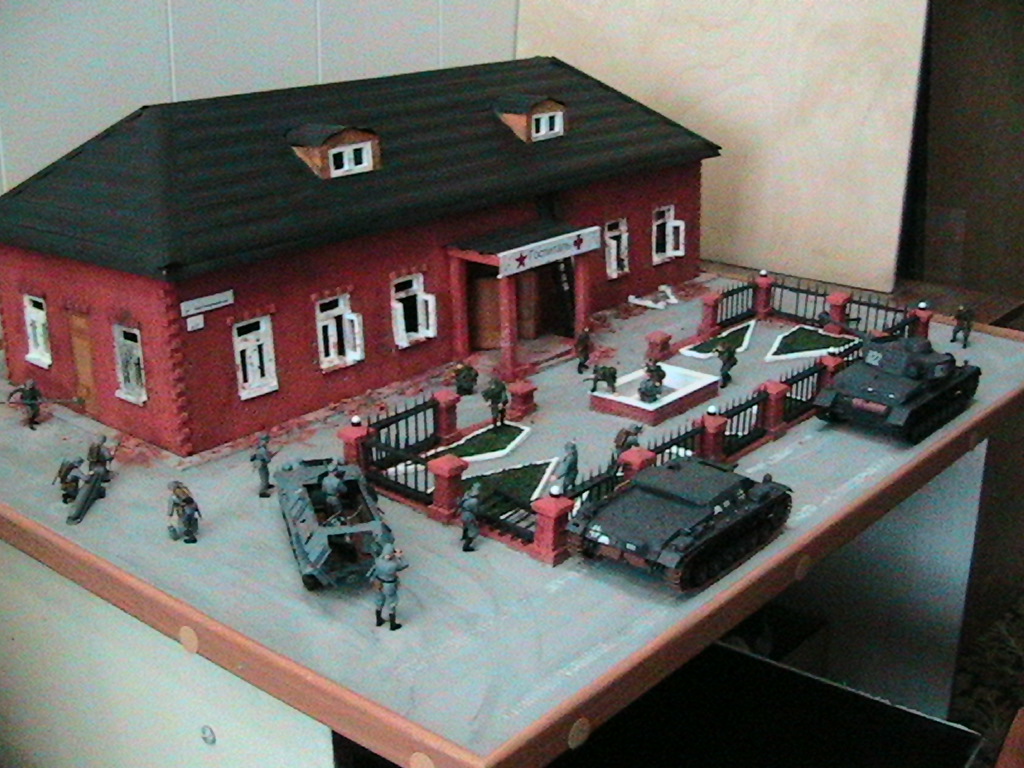 Ну суть диарамы в том что вначале госпиталь обстреливал танк, а потом подошлел бтр с немцами и они стали штурмовать, наши решили не дожидать и пошли в атаку.С тонировкой и грязью - буду учиться...