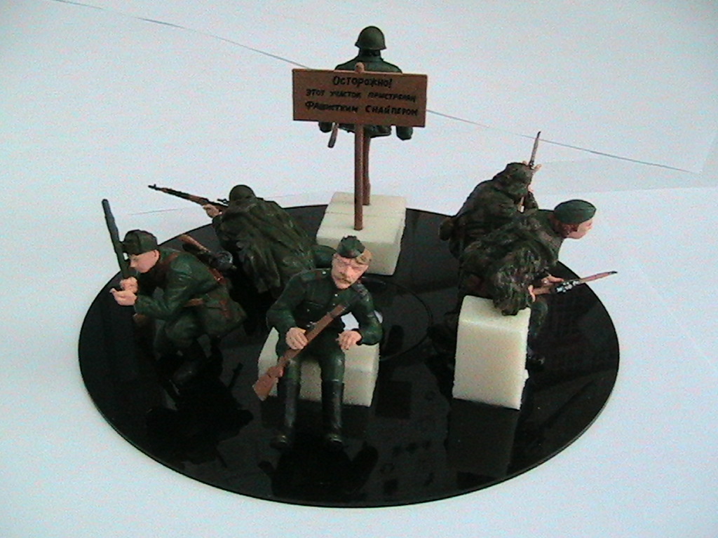 александр бизин, Вы меня извините, но всё, что вы наговорили о сюжете вашей, хм, композиции - полнейший бред! В моделизме, и диорамостроении в частности, есть одно непреложное правило - всё должно быть композиционно взаимосвязано. У вас же - несколько наборов фигурок с техникой поставленные в некий ландшафт и всё. А где сюжет - его нет, каждый персонаж сам по себе. Танк с орудием, но у здания ни одной дырки. Русские атакуют, а немец спокойно подходит к двери с зарядом ВВ. Чем меньше вопросов возникает у зрителя, тем лучше справился автор с задачей. Это первое. Второе - может стоило сначала не браться за такие полотна, а попробовать виньетку сделать. Не знаете, что это такое - зайдите в галерею - примеров малогабаритных работ полно. В-третьих, хоть это и не моя обязанность, админы, наверно, ушли на каникулы отдохнуть - праздники всё-таки. Так вот: вы, когда регистрировались на форума, правила прочитали как все русские люди - неглядя - или всё же потрудились? Так вот, если бы потрудились, знали бы, что теперь работы можно выкладывать в разделе учебка самостоятельно. А вашей композиции там самое место, не так ли? С праздниками
