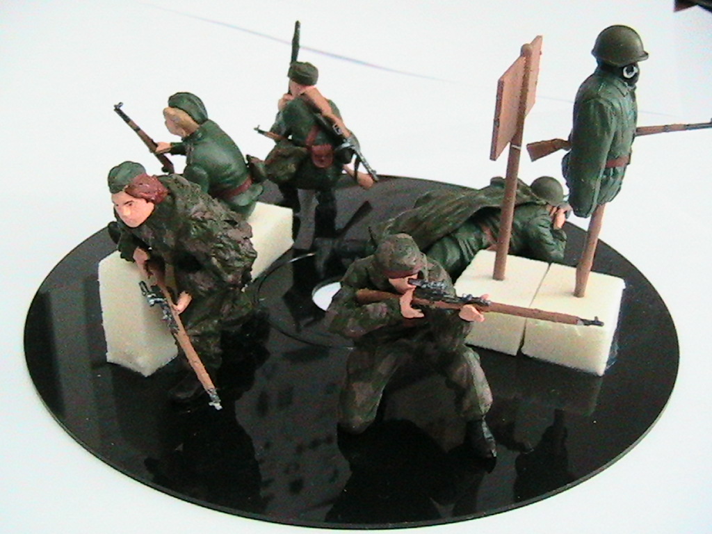 фигурок набрал на диараму "Оборона госпиталя" и задумка была поставить рядом ещё один дом двухэтажный- комендатуру, расположить там снайперов. однако в последний момент передумал и расположил в "Обороне госпиталя" с тыльной части здания Зис-5в , санитаров , группу прикрытия из снайперов. Между зданиями ещё пушечный расчет должен был стоять. Диараму "Оборона госпиталя " скомкал конечно, но иначе она ни в какие ворота не вошла бы...