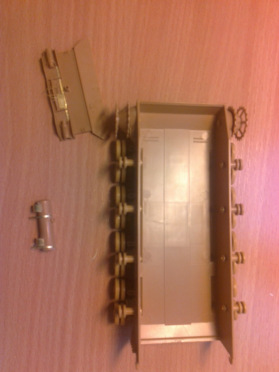 1. Если планируется танк, простоявший лет 20-ть, то крепление на шанцевый инструмент (и другой мелкий крепёж) на РЕ лучше не менять, т.к. за 20 лет ржавчина превратит крепления во что угодно (можно из тонкого пластика, например от доширака, сделать имитацию замков и петель, а сам инструмент разложить на виньетке около штатных мест, предварительно испоганя).