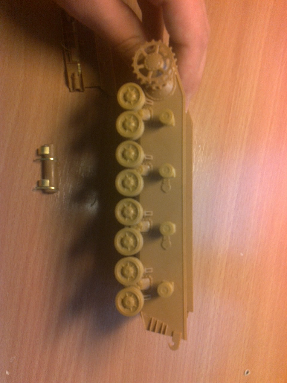 Ну наверное рановато катки приклеивать сразу, а как потом их красить будешь.Я бы сначала покрасил их отдельно, потом между собой склеил, и к модели клеил бы в последнюю очередь, к покрашенному корпусу.