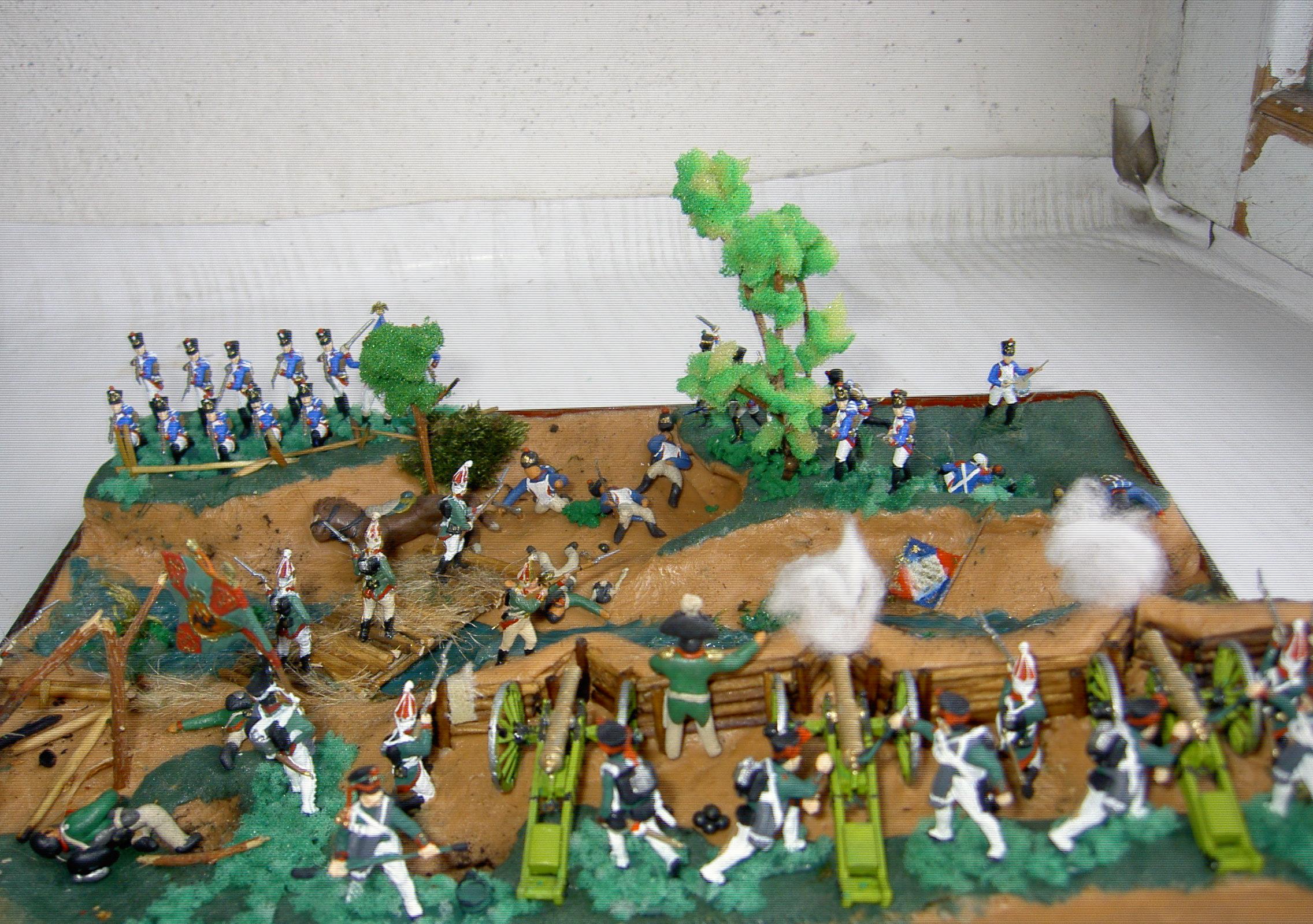 В диораме представлен момент сражения при Бородине, когда события на левом фланге русской армии, после взятия Багратионовых флешей переносятся на ручей Семеновский. Солдаты сводно-гренадерской дивизии идут в контратаку на французскую дивизию генерала Фриана.