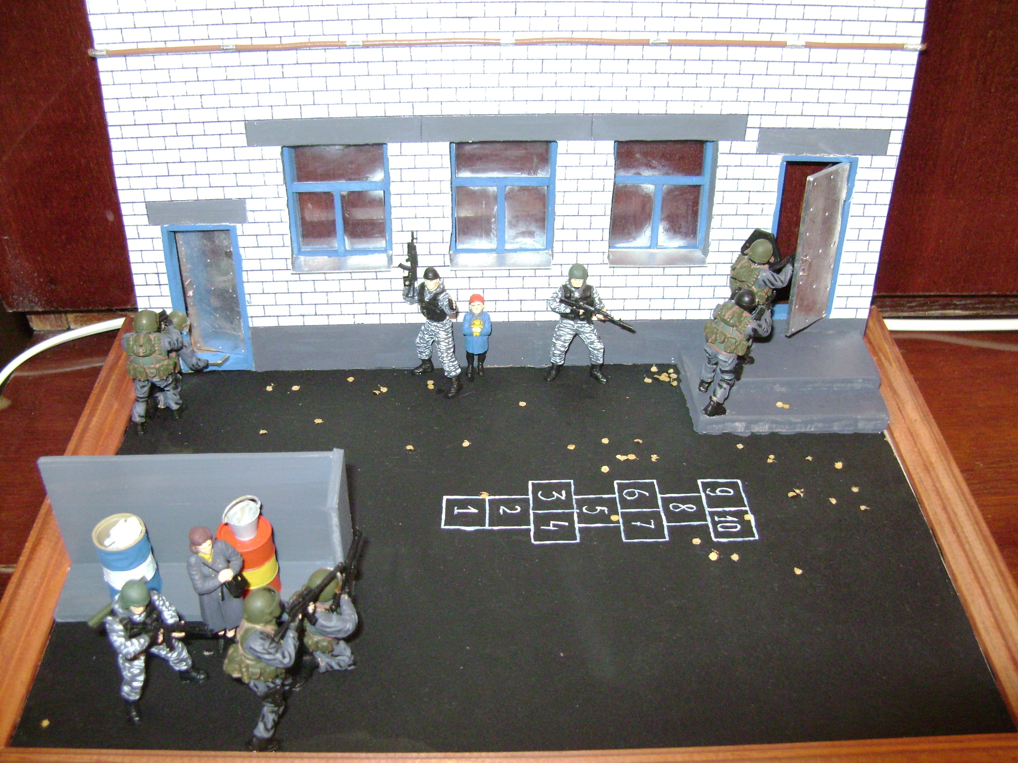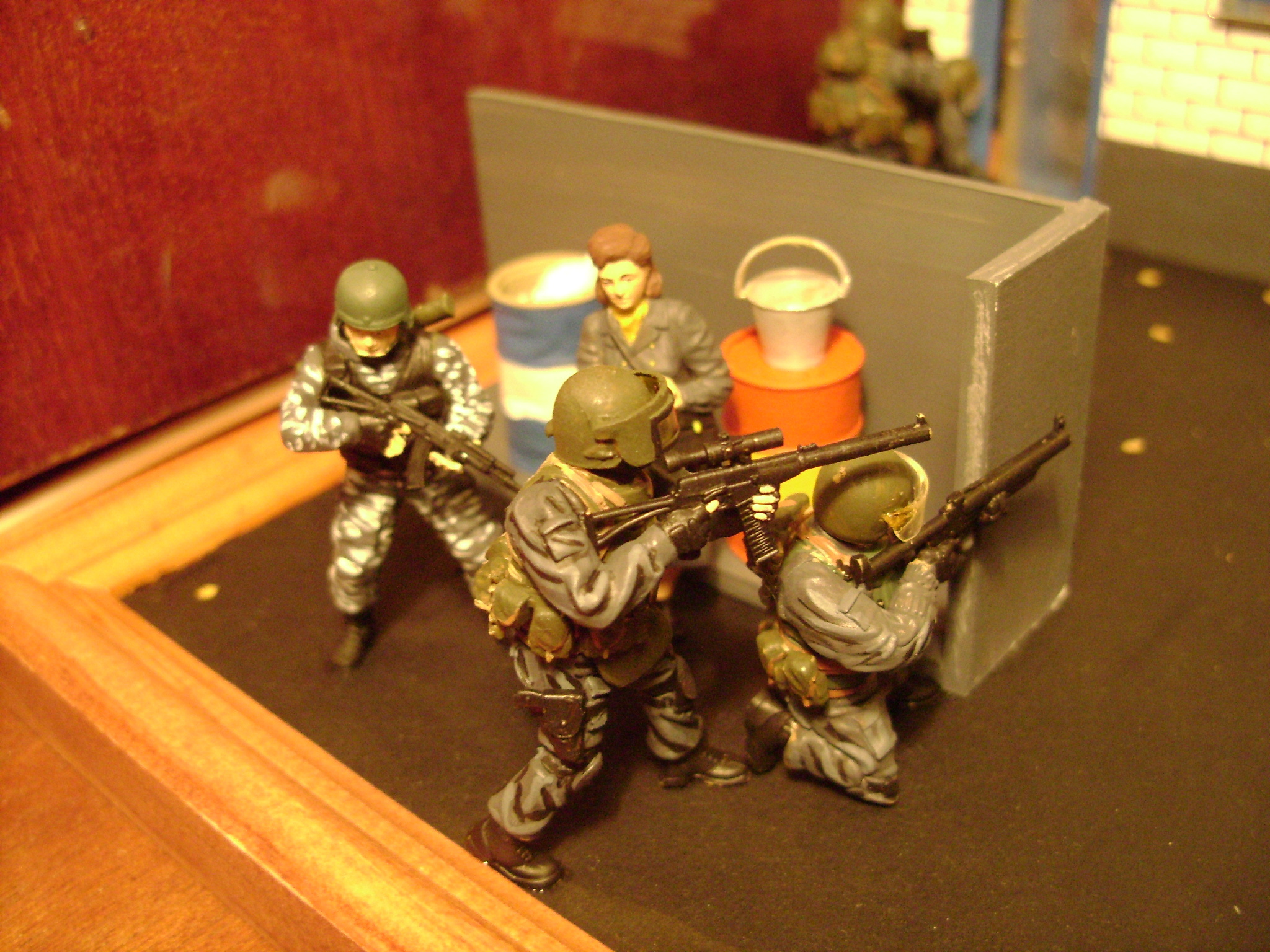 Вам тоже привет! Начну с того - что у меня такой же набор. Сам тоже хотел сделать диораму. У меня там бы действие происходило на заброшенной местности, ну, это ладно... Касаясь вашей работы - окрасили фигурки довольно аккуратно. Но всё же - при окраске гражданских слишком однообразный цвет и нету практически тонировки, что портит аккуратность окраски. Попробуйте добавить на асфальте пыль, камешки. Асфальт же в жизни не такой ровно окрашенный и чистый. Запылите у бойцов ботинки. Какие-нибудь царапины на шлемах. Что касается бочек, которые стоят за углом - они слишком равномерно покрашены. Добавьте тоже пыль, немного ржавчины или сколов. Какие-то потёки или лужи на асфальте. Кирпичную стену тоже нужно затонировать.Посмотрите на реальные фотографии кирпичных стен или просто посмотрите на них в реальной жизни. И попробуйте создать тот же эффект на вашей диораме. Вообще - создание подобных реальный эффектов очень трудное занятие, поэтому я вас не сужу. Это действительно очень трудно.Вообще, во всей диораме мне понравилась только аккуратная окраска фигурок. И стена тоже очень хорошо сделана. Но минус в стене и во всём - это то, что оно выглядит, как с конвейера. Очень уж новое всё блестящее. А в целом - вы приложили большие усилия в свою работу! С уважением. Могу посоветовать уроки ржавчины от Роба Ферейра - http://ost-front.ru/2011/01/03/tutorial_ferreira2/