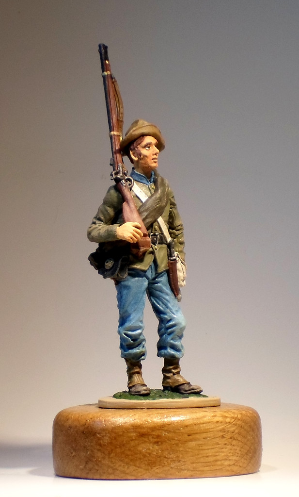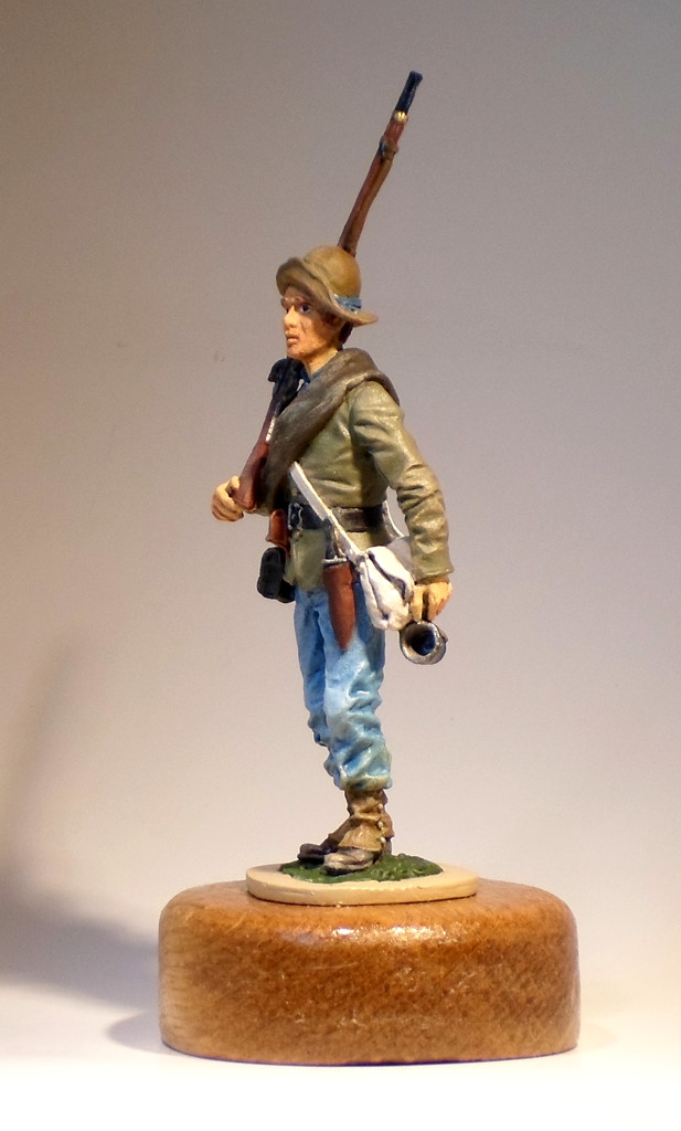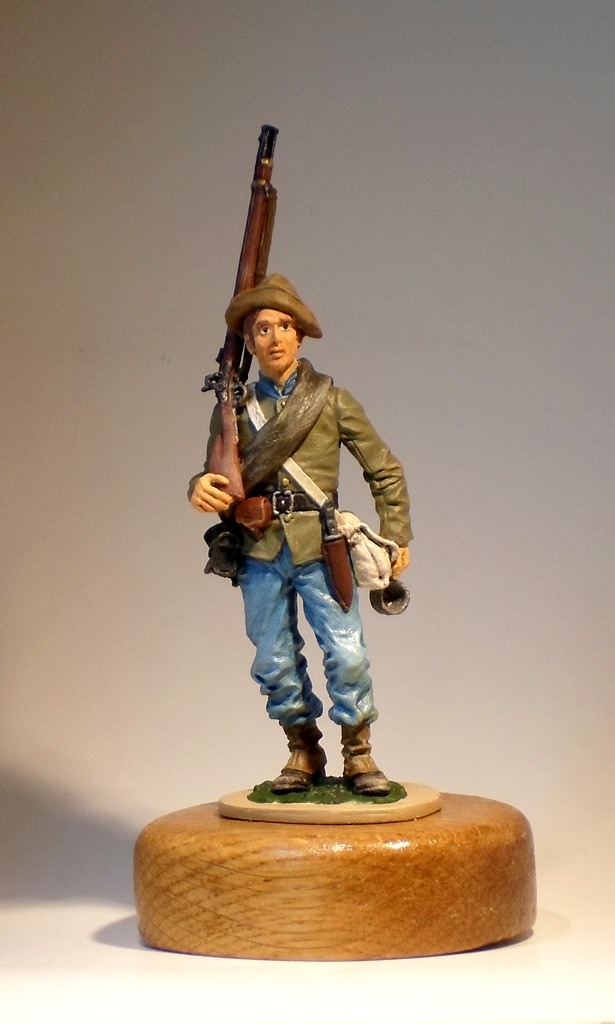 Роспись понравилась, всё красиво и аккуратно. Единственно что смущает, так это цвет мундира. Синий воротник подразумевает серый окрас . Зелёный - это уже что-то своё, принесённое из дома или где-то свистнутое, а тогда воротник должен быть одного цвета с курткой (в этом случае это не мундир получается, а куртка). Персонаж получается скорее на Западный театр войны: там и снабжение похуже было, да и штаны у парня явно из запасов северян... Так что исправить воротник, что проще, и солдат Миссисипской или Теннесийской армии во всей красе!