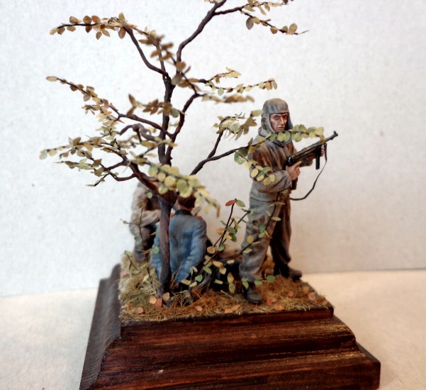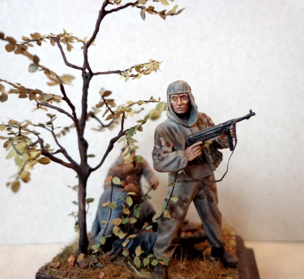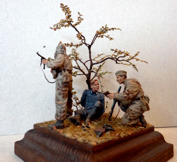 Данную виньетку сделал примерно пол-года назад. Исходные дрова - разведка от Звезды. Собственно всем известный "дровяной" набор, но вполне подходящий под запиливание. Вобщем-то пилил только пленного. А именно заменил голову от Драгона Ген-2.Притом голова теперь состоит из 3-х частей: лица и затылка Ген-2 + "арийский скальп" исходной Звезды. Скальп прирос отлично.