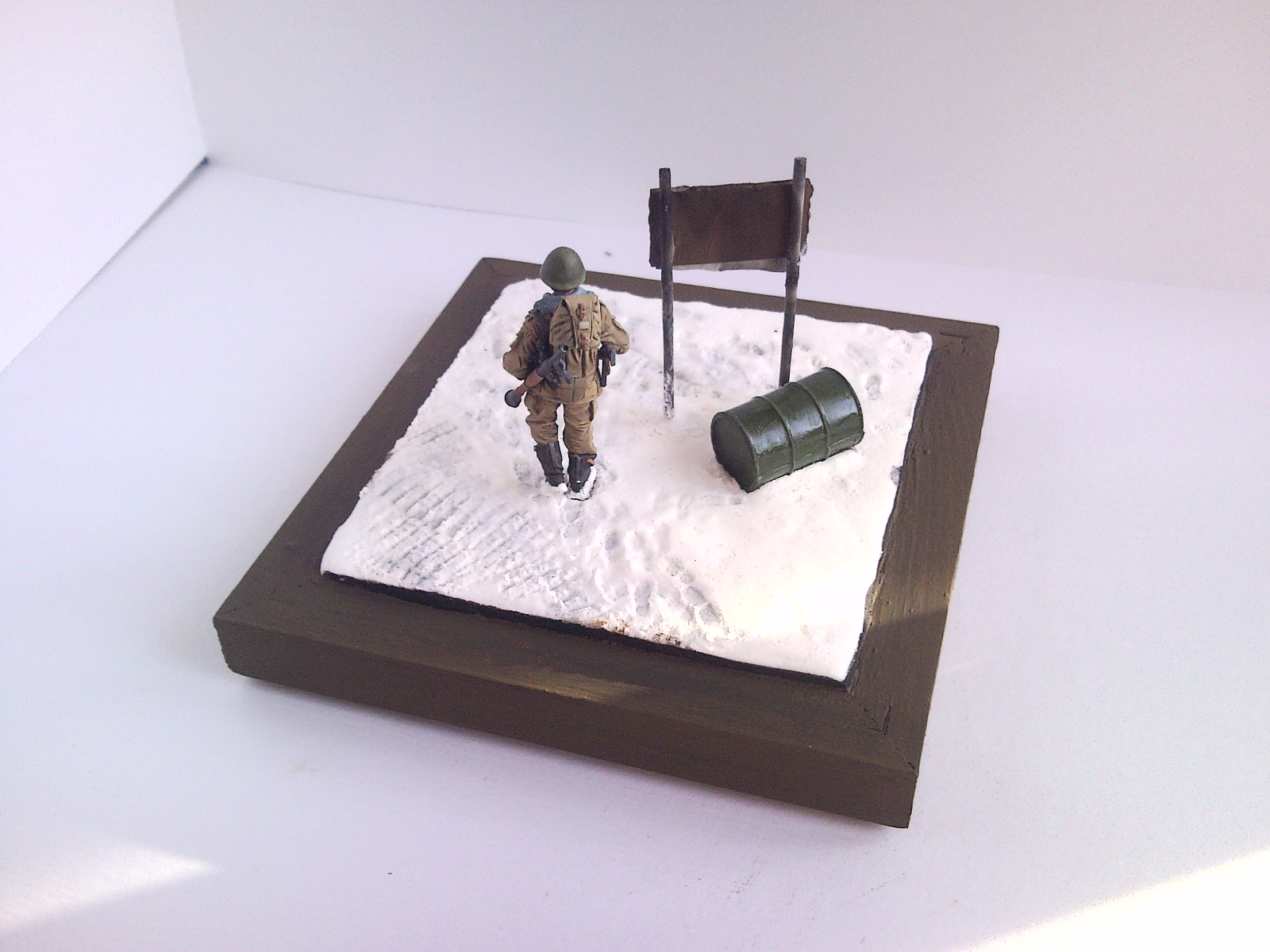 Неплохая работа, понравилось. Даже относительно "пустое" основание и чистый снег играют в её пользу, вроде как за табличкой будут и грязь и развалины... Вот только солдат, получается, идёт ИЗ "ада". Лучше бы его развернуть чтоб шёл ТУДА.