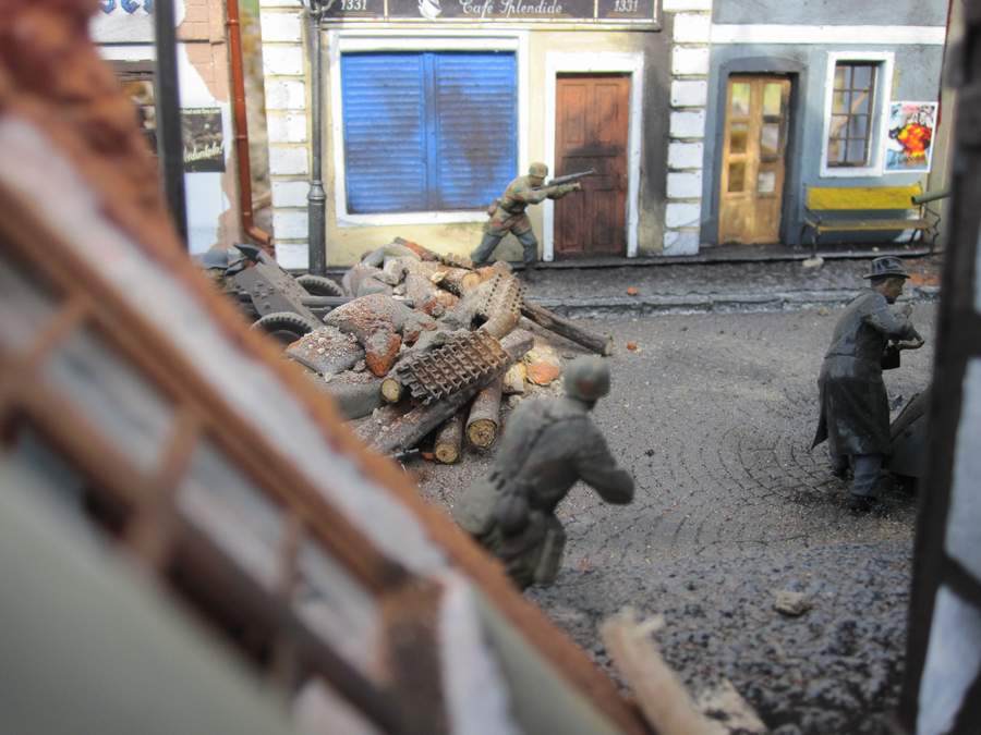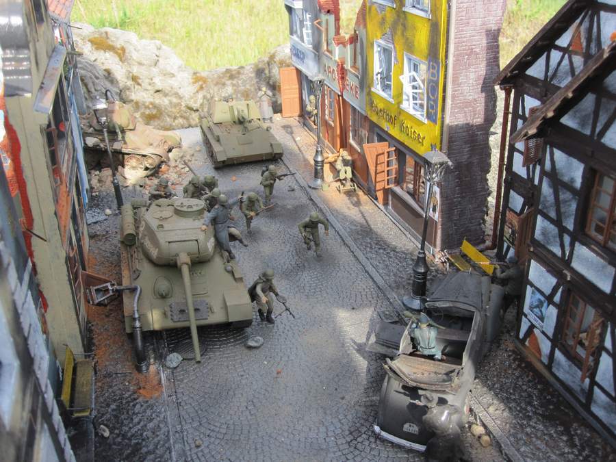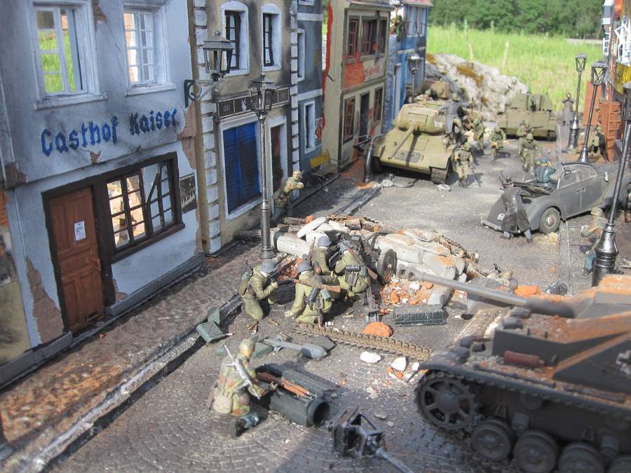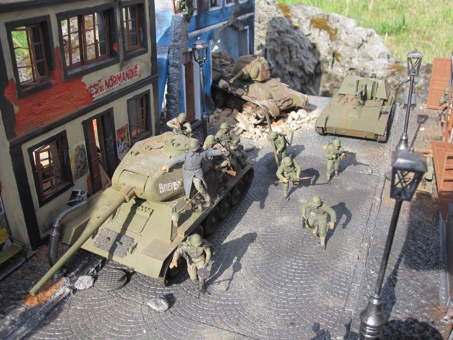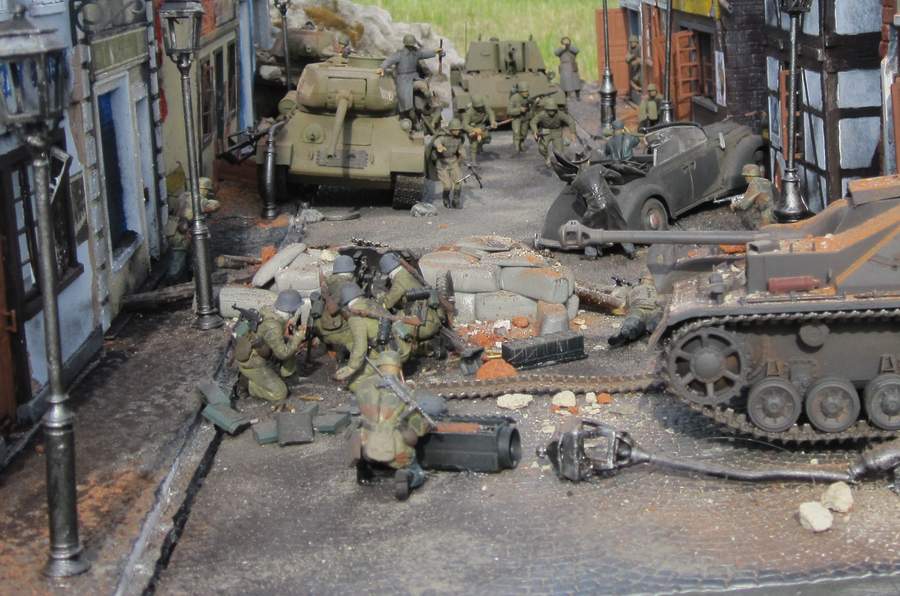 ученик, за масштабность работы 5+. А по деталям - очень хромает сюжет и исполнение. За качество покраски говорить не будем, в конце концов на такой диораме тщательно прописывать каждую фигуру - адский труд. Но с техникой стоило больше повозиться, придать ей поношенный вид. Далее: квартал весь в руинах, но очень мало мусора для таких расзушений - улица частая. У Штуга катки и гусеницы не стоят на основании плотно, а висят в воздухе (предпоследнее фото), стоило, наверное, во время сборки модели пригнать ходовую к основанию более тщательно. Подбитая гусеница так с ведущего колеса не упадёт, изогнуть можно было бы. Советские солдаты прям так и бегут грудью под пули. Наверное, стоило взять другой набор и фигурки расположить около зданий, или за танками. Кстати, вторая Т-34, наверное, прострелит зад впереди идущей - целится точно в корму. Фонарные столбы не погнутся, они просто сломаются, если их протаранит танк. Ну, вкратце всё, удачи в новых работах)