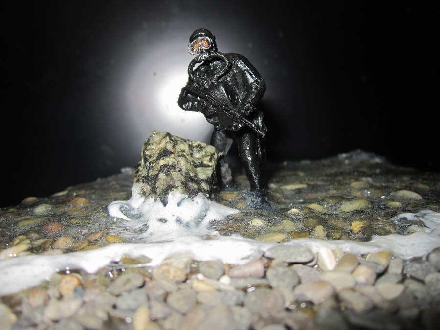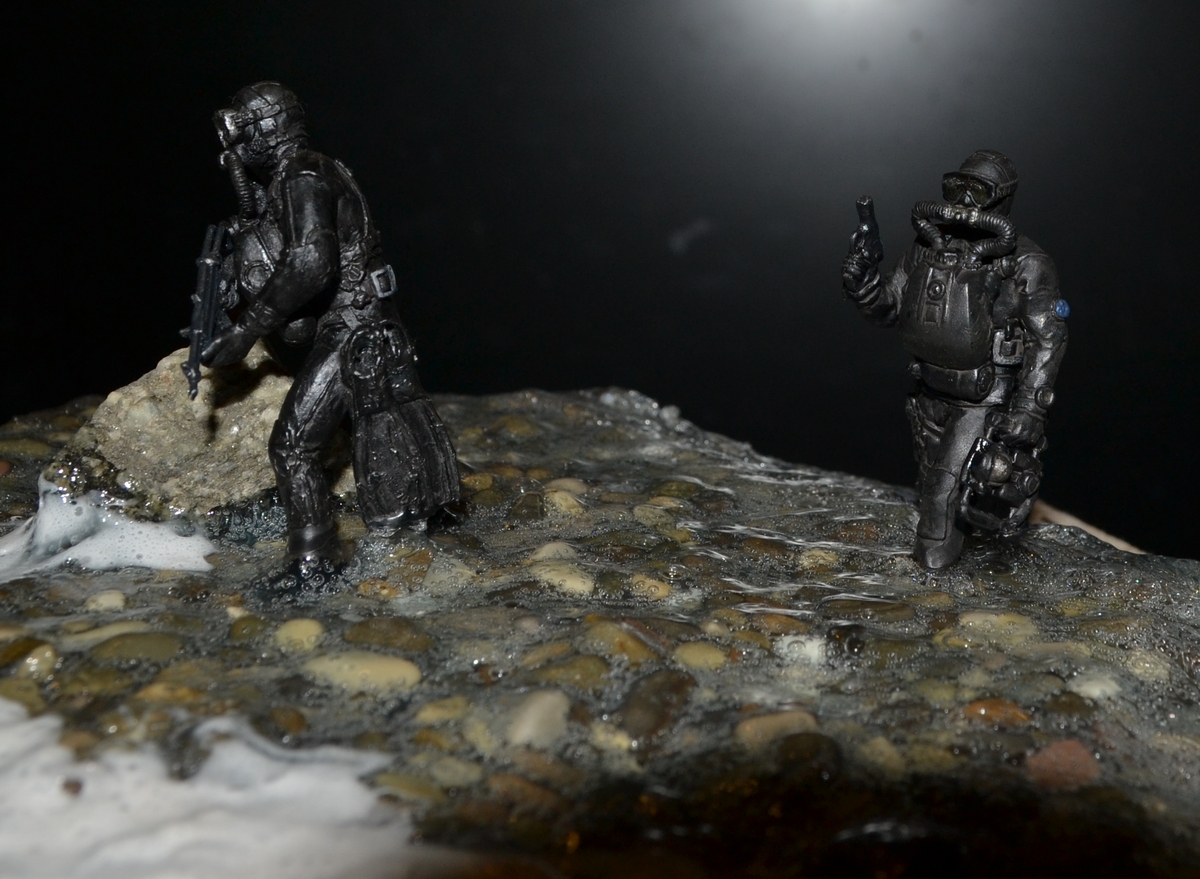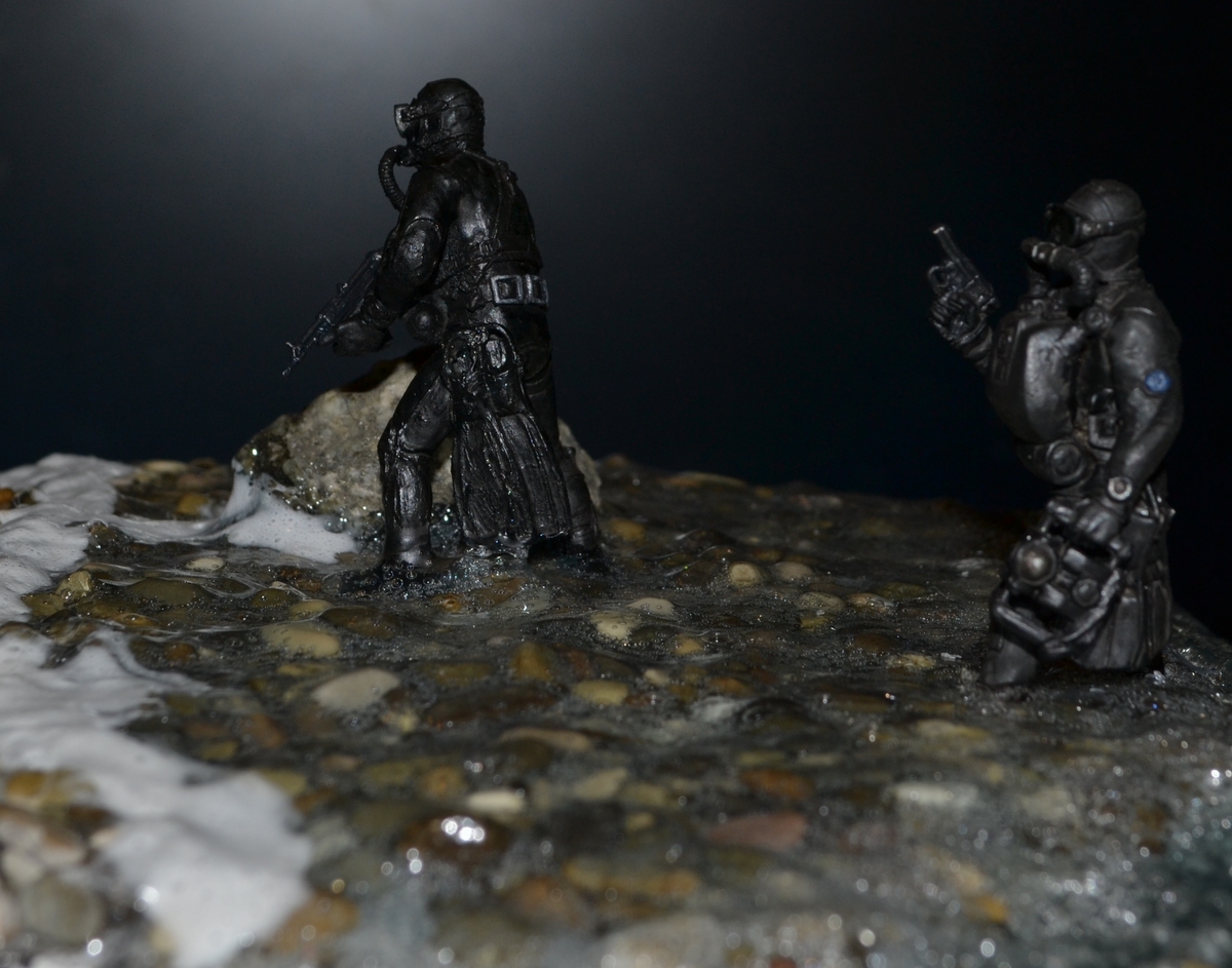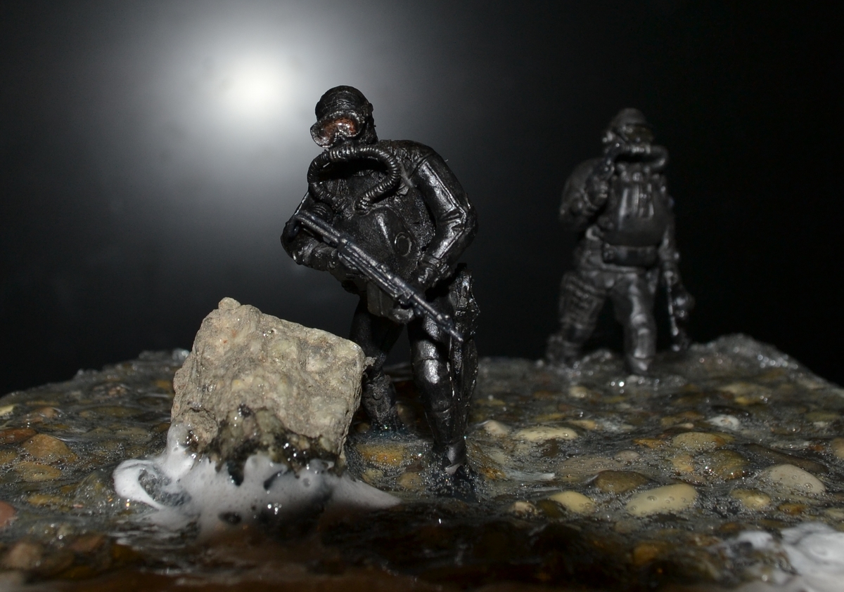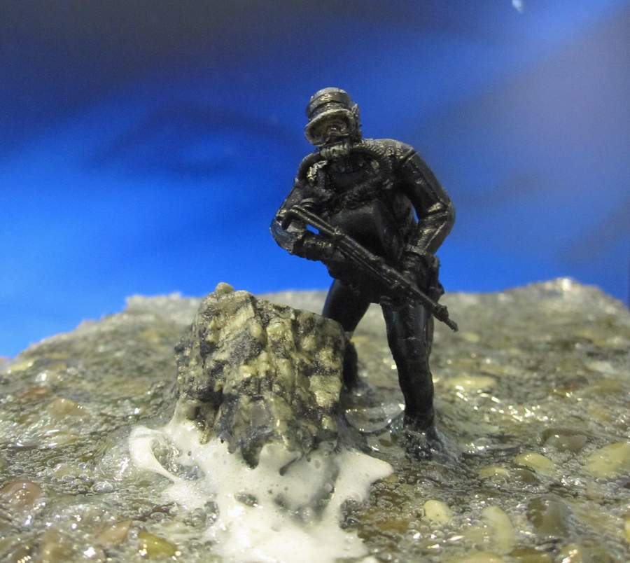 синей тамия. Сам боевой пловец покрашен чёрной матовой из балончика, дал эффект мокрого костюма, грузила и ремни - серая и чёрная матовая тамия. Стекло маски клей титан.