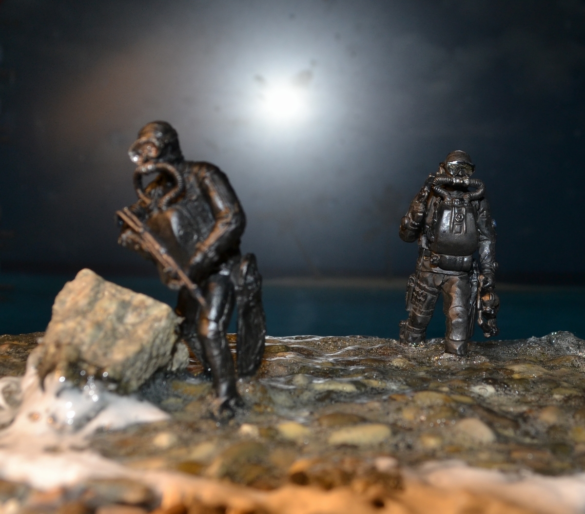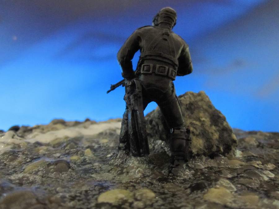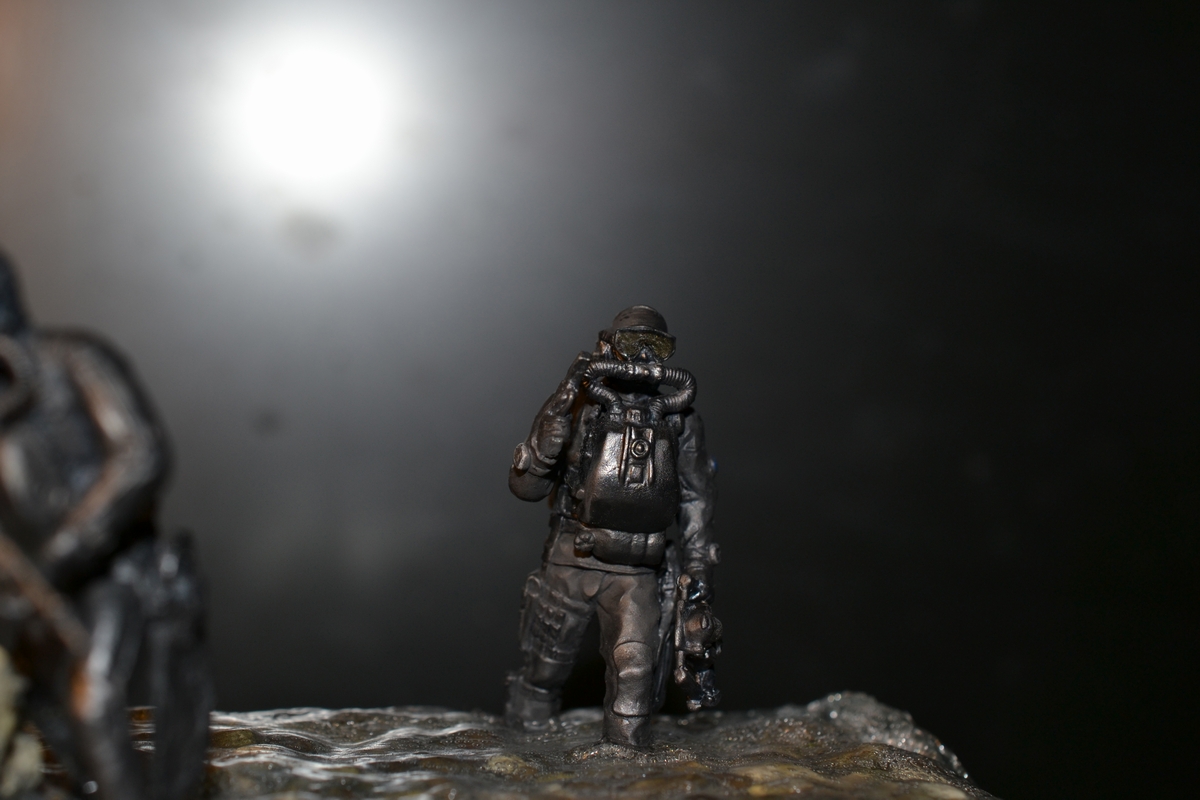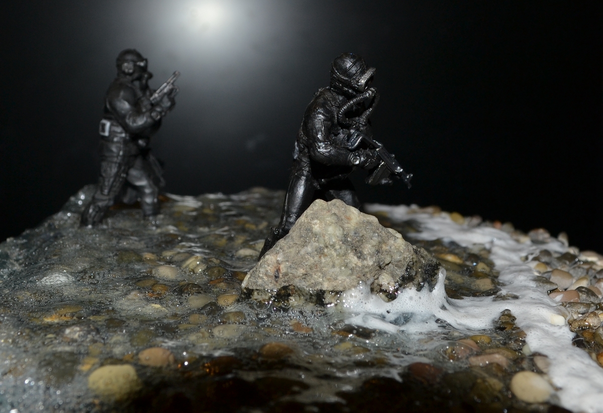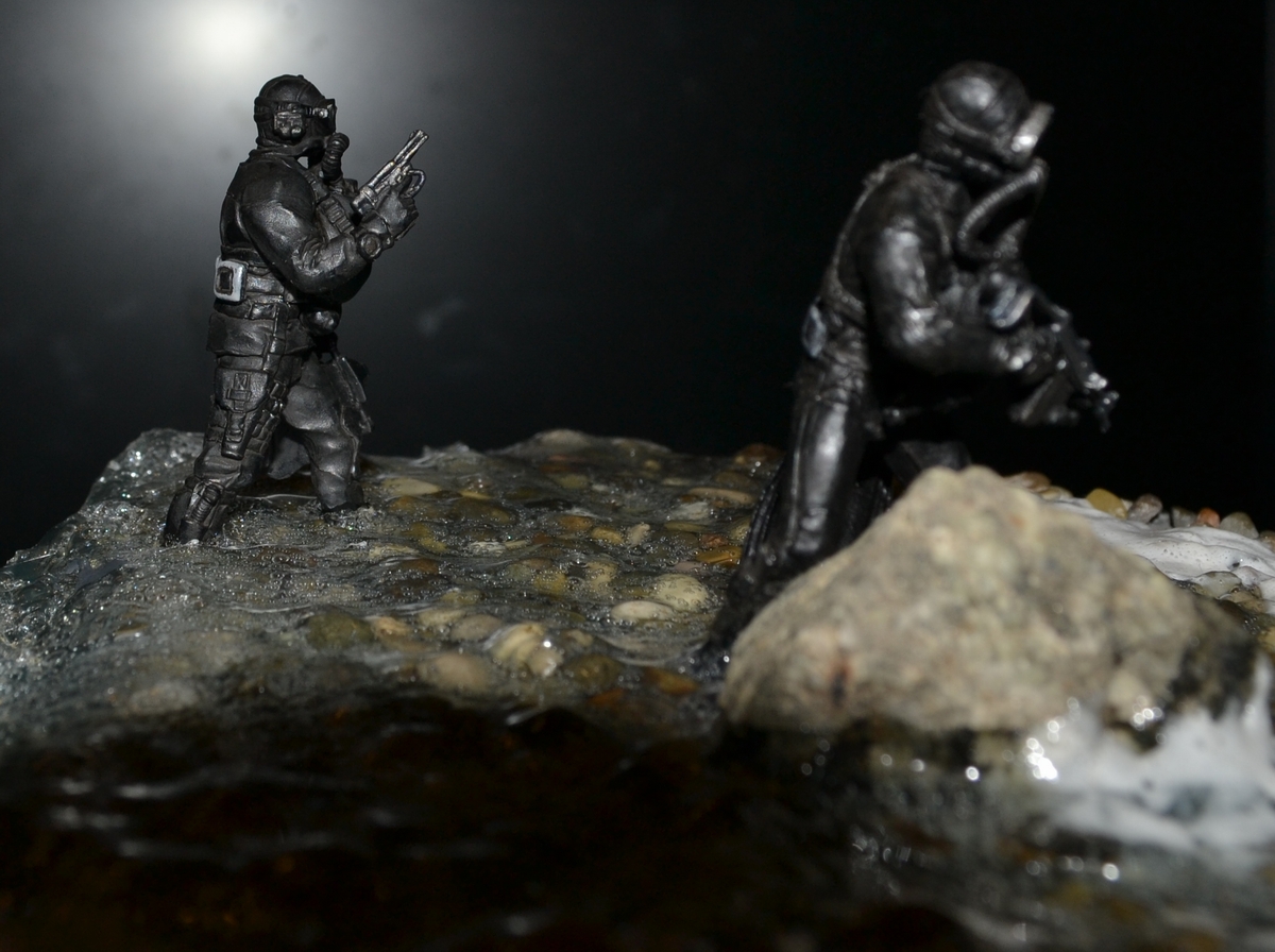 синей тамия. Сам боевой пловец покрашен чёрной матовой из балончика, дал эффект мокрого костюма, грузила и ремни - серая и чёрная матовая тамия. Стекло маски клей титан.