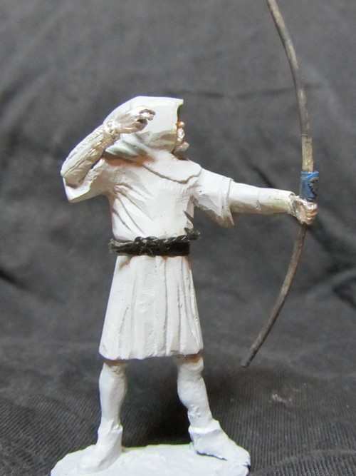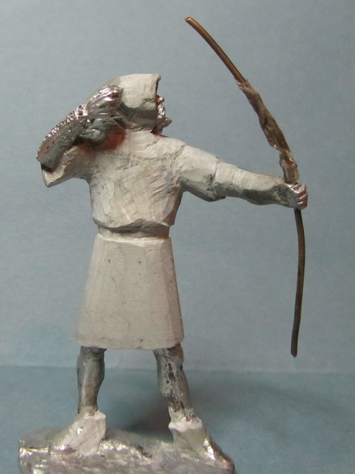 Интересная задумка! Пока трудно сказать за всю фигуру, но вот капюшон надо переделать: во-первых он очень велик сзади, а во-вторых возле шеи он не должен так плотно облегать голову, скорее "раздаться" в стороны. И ещё попробуйте ему распрямить пальцы на правой руке: стрелу-то он отпустил.
