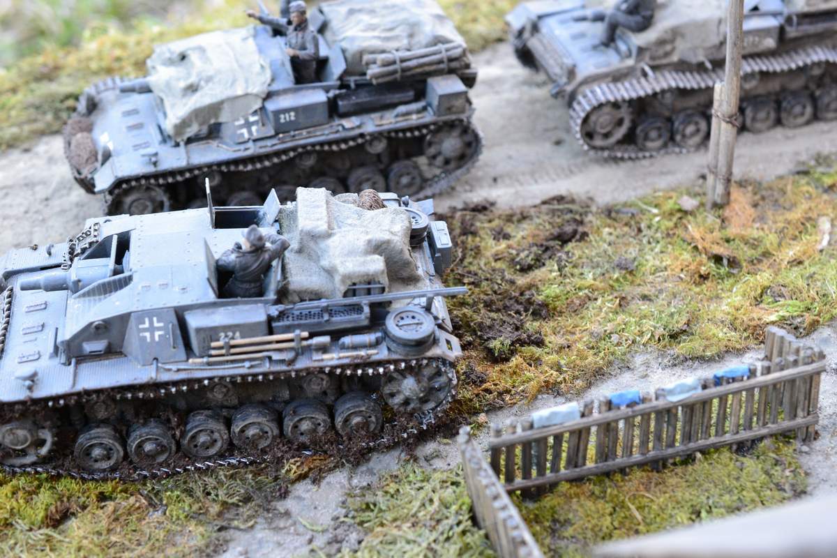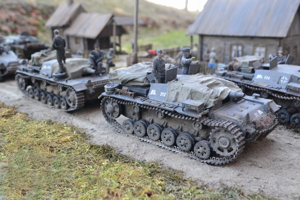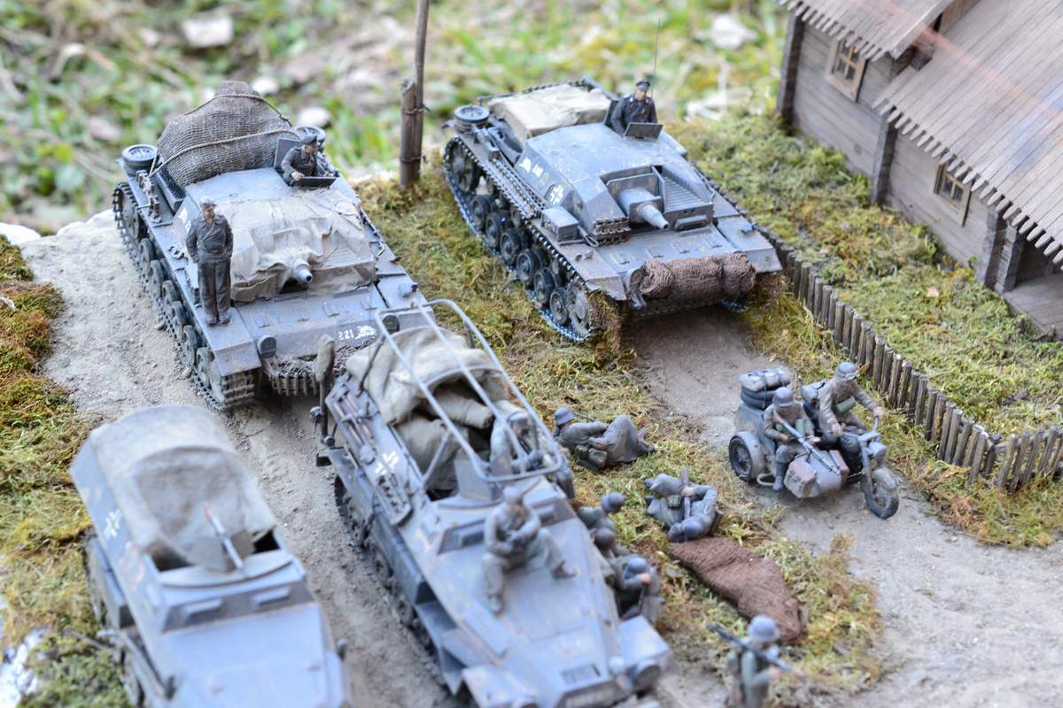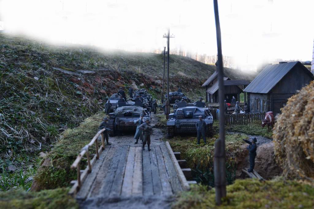 Масштаб 1/35. При построении использовал модели и фигуры Zvezda, Dragon, MB, Tank, Бастион 35, Mini Art . Красил красками TAMIA,тонировки MIG и самодельные на основе масляных красок. Основание диорамы монтажная пена, растительность натуральный мох.