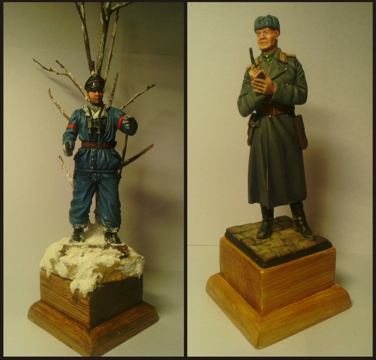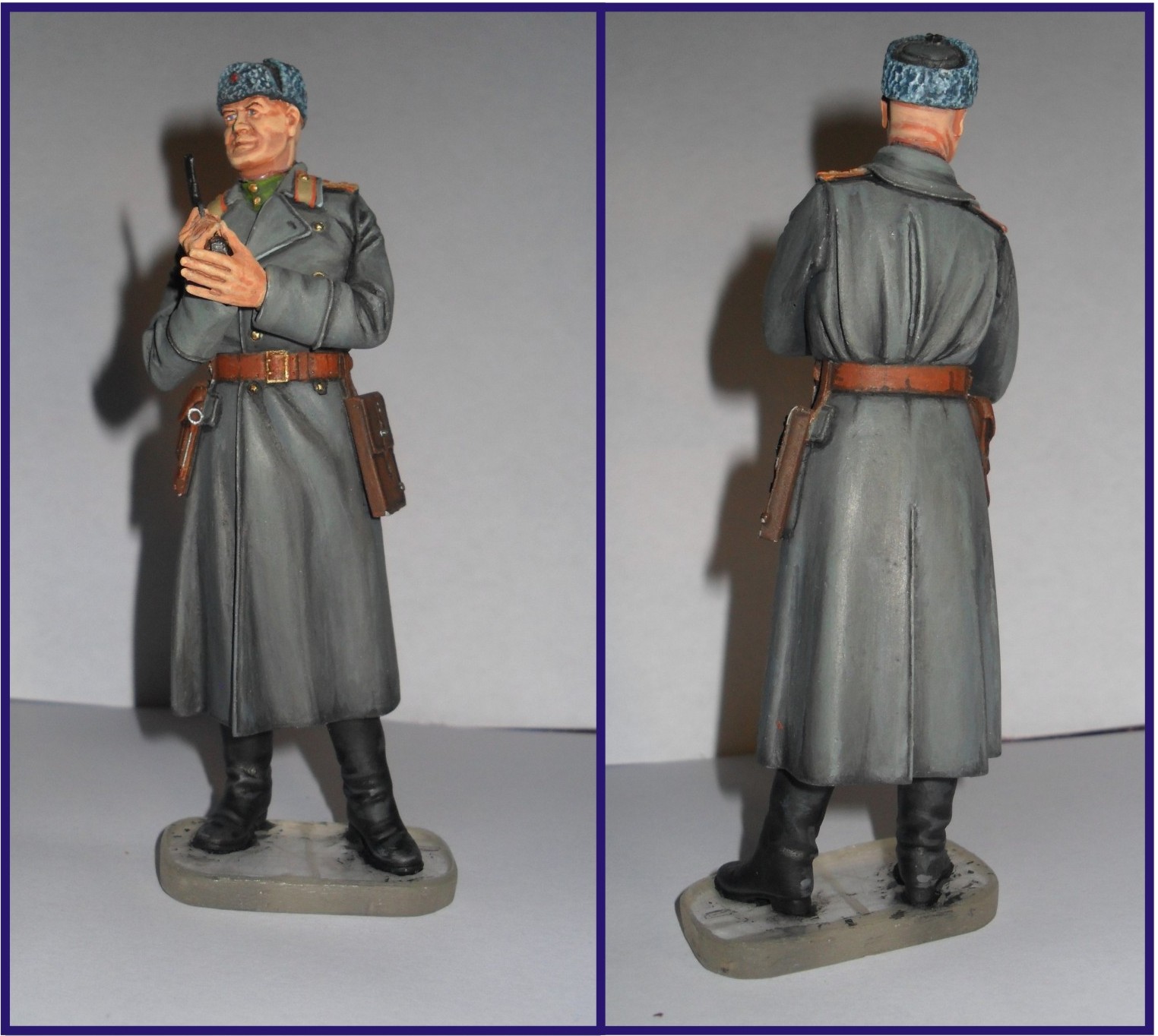 Офицер РККА 1945г. м1:16, производство Верлинден, окрашен грунт Тимия, акрил Звезда. Звездовский акрил конешно те еще краски, но на данный момент под рукой больше ничего нет. Да и покраска получилась многострадальная голова перекрашивалась 3 раза, сапоги 2 раза, во время уборки уронили, переклеивал - голова плохо села на место, в последствии голова еще раз отлетела, так что она посажена в данный момент кое как(. Так что ругаем и даем советы, рад буду всему)!