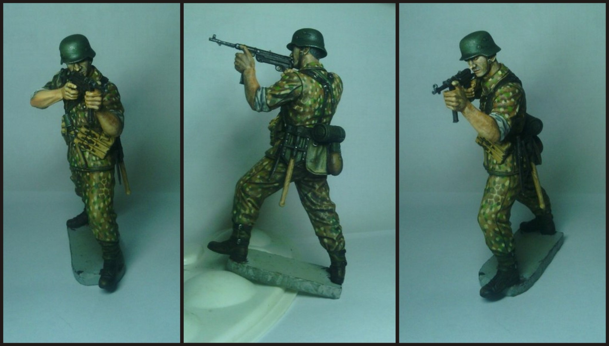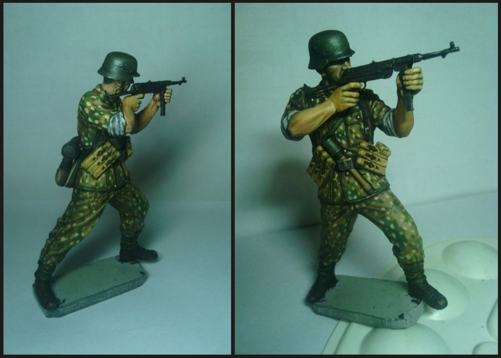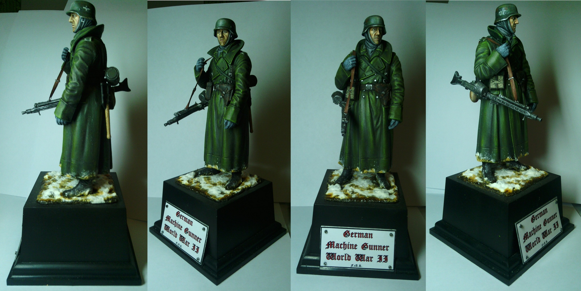 А вот новая законченная работа - немецкий пулеметчик, Тамия 1:16. Грунт Тамия, акрил Звезда. Доработки, вентиляционные отверстия на каске, крепление банки с противогазом и фляги, дуло высверлено, ремень пулемета.