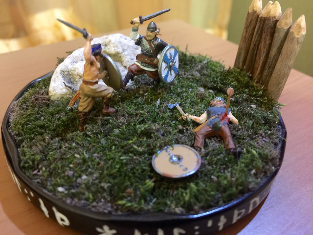 Первая работа, ранее никогда ничего подобного делать не пробовал. Сюжет – сцена набега норвежцев на одно из скандинавских поселений (шведы, либо датчане). К конкретным историческим событиям не привязана. Использовались миниатюры производства фирмы «Звезда», набор - «Викинги. IX-XI AD.», масштаб 1:72. Для покраски использовались акриловые краски «Звезда». Для основания использовалась жестяная крышка от банки, наполнение – земля, мох, природный камень, дерево.