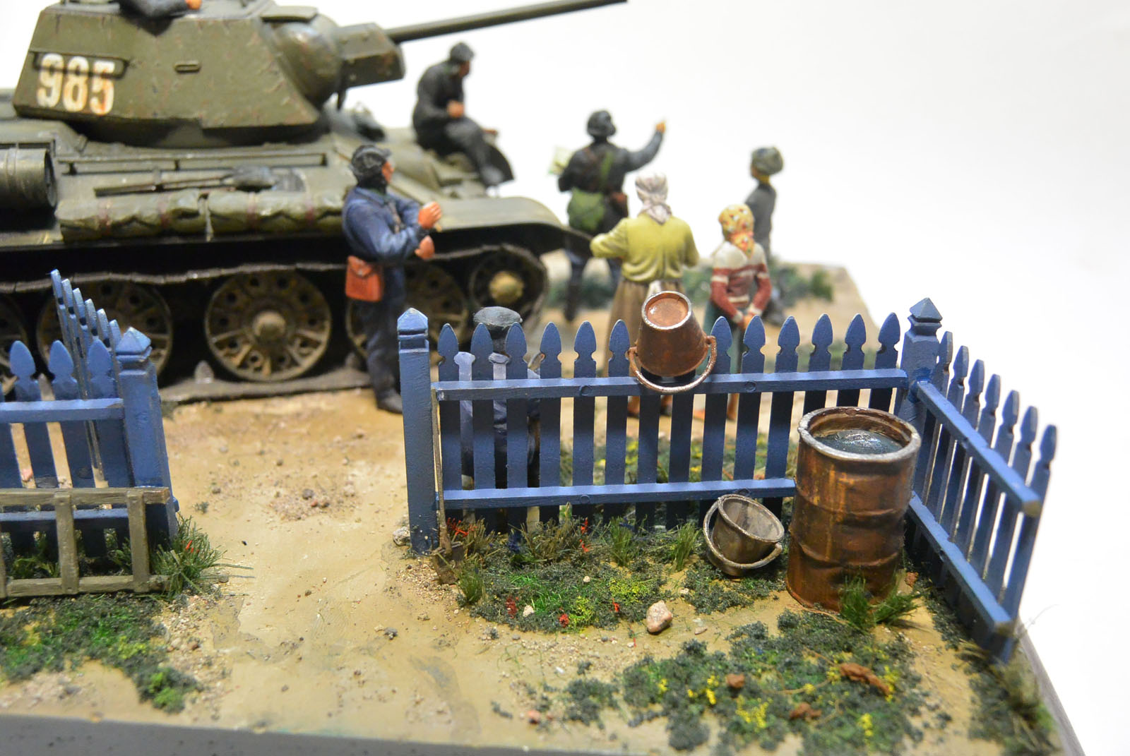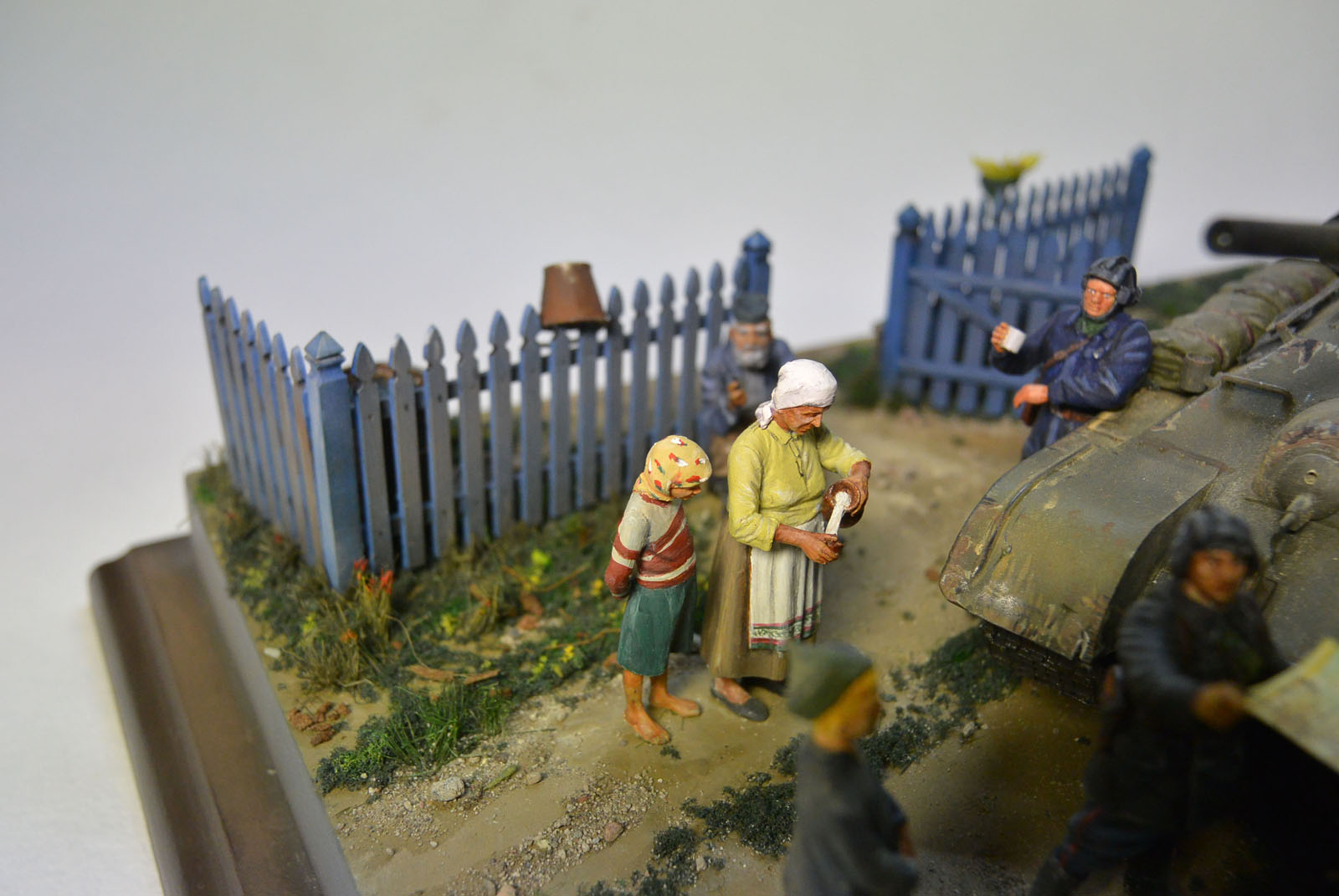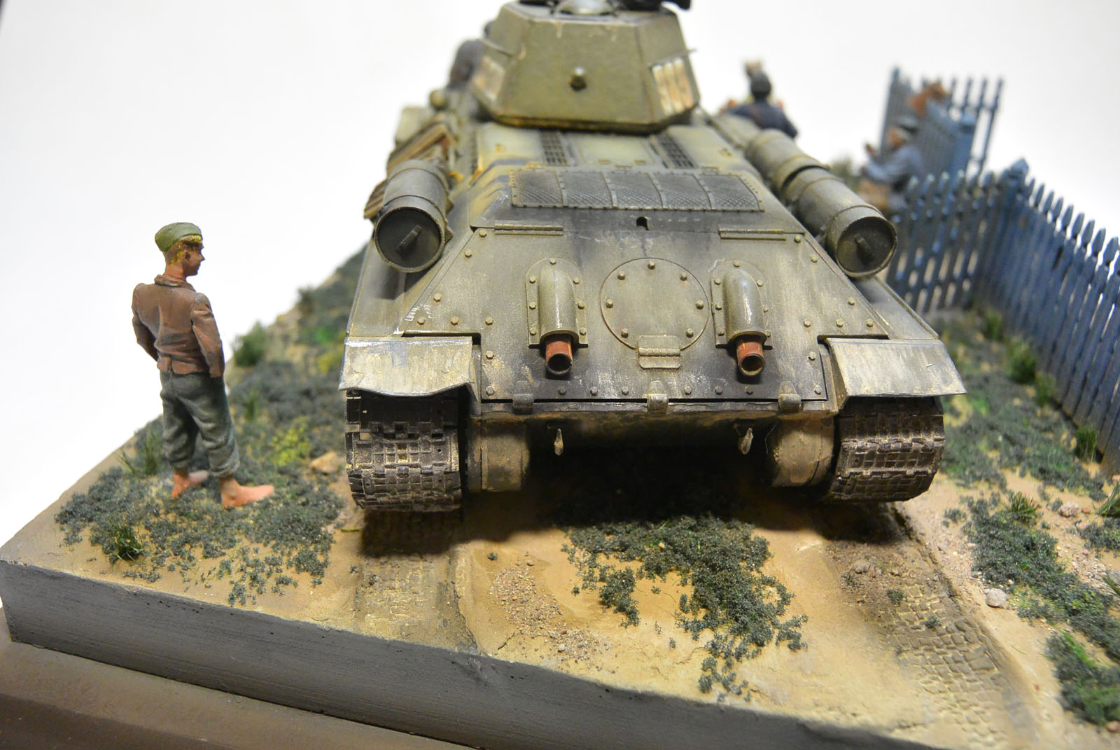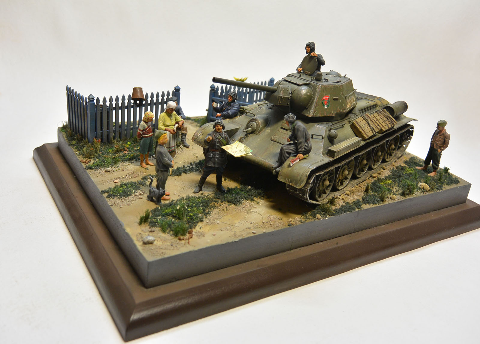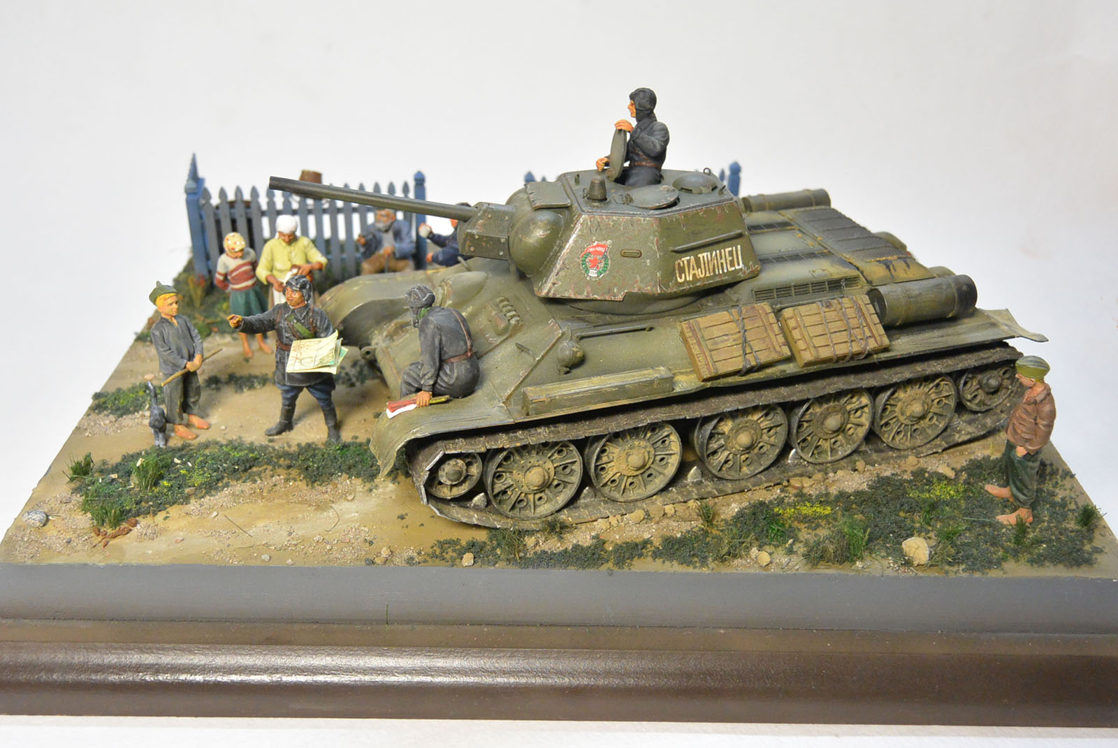 Основание гипс. 34-ка окрашена акрилом tamiya, нанесены фильтры и пигменты MIG, всё остальное окрашено воско-маслянной и пва темперой.