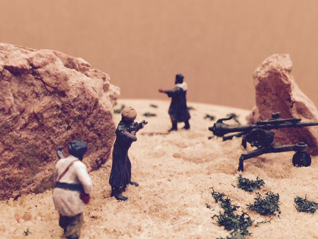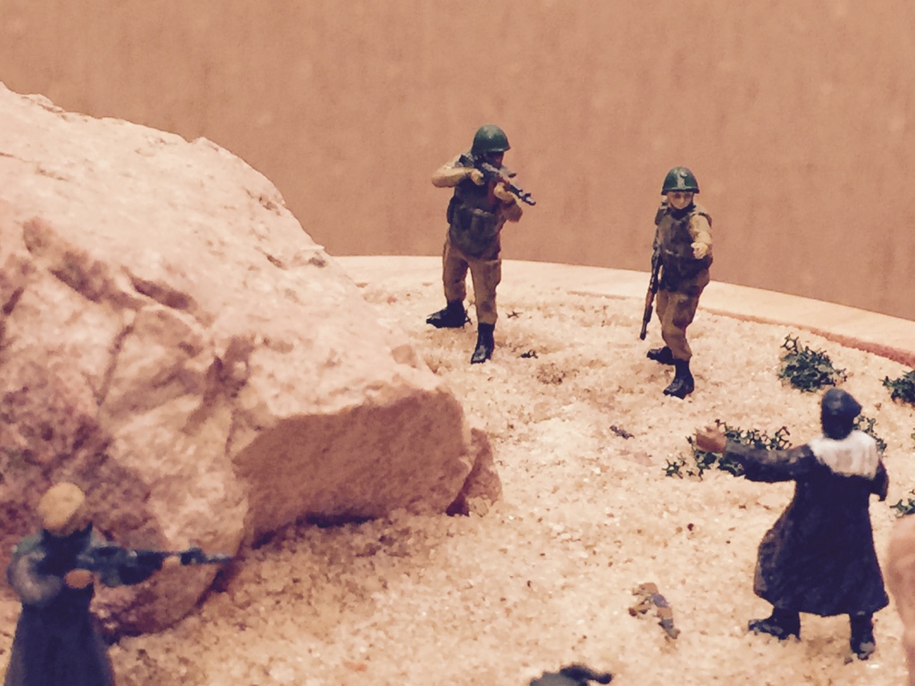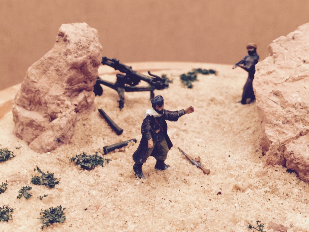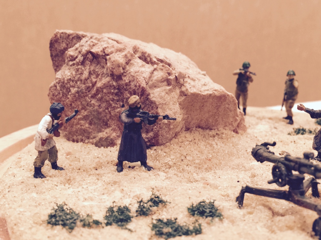 Доброе время суток! неплохо, однако вышло. Аккуратно цельно. но как всегда есть "но". если Вы хотите делать диорамы, в которых помимо простых баталий имеют место эмоциональная составляющая - в данном случае наверняка "дух" орет на каком-нибудь своем наречии мол "не убивай меня, Шурави в кишлаке жена, дети!" а наши в свою очередь возможно кроют отборным матом и соответственно "Ложись, руки в гору, автомат на землю!" видите? - эмоции. я это развожу здесь к тому, что для подобной диорамы маловат масштаб! ведь 72-ой как правило используют для баталий в которых участвуют огромное количество фигурок. Мой Вам совет: попробуйте 1/35. Вполне подходящий масштаб для Вашего отражения характера каждого отдельного героя. Честь имею!