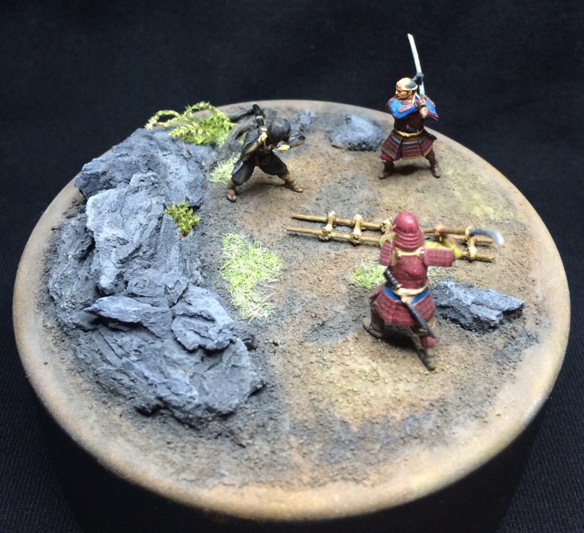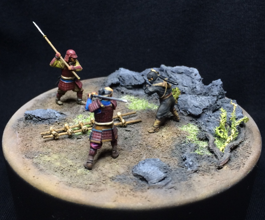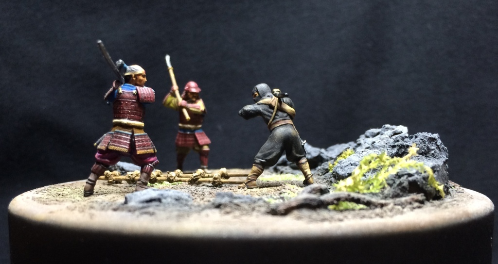 Если честно, мысль изначально была, просто схватка 2 на 5, потом упростил до 1 на 2. В процессе начал искать инфу о синоби и самураях. И да, 47 ронинов, восстание Ига и севера Кога. Задумок много было. Одна из - замок Дайме, в два этажа с разрезом. Внутри прием послов. Внутренний двор - тренировка самураев. Частокол и за ним рисовое поле с крестьянами. В ворота скачет гонец, но синоби уже на крыше и скрытно во дворе.