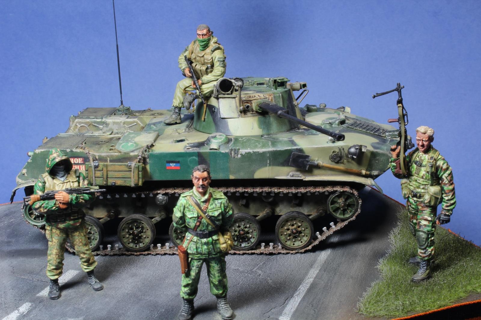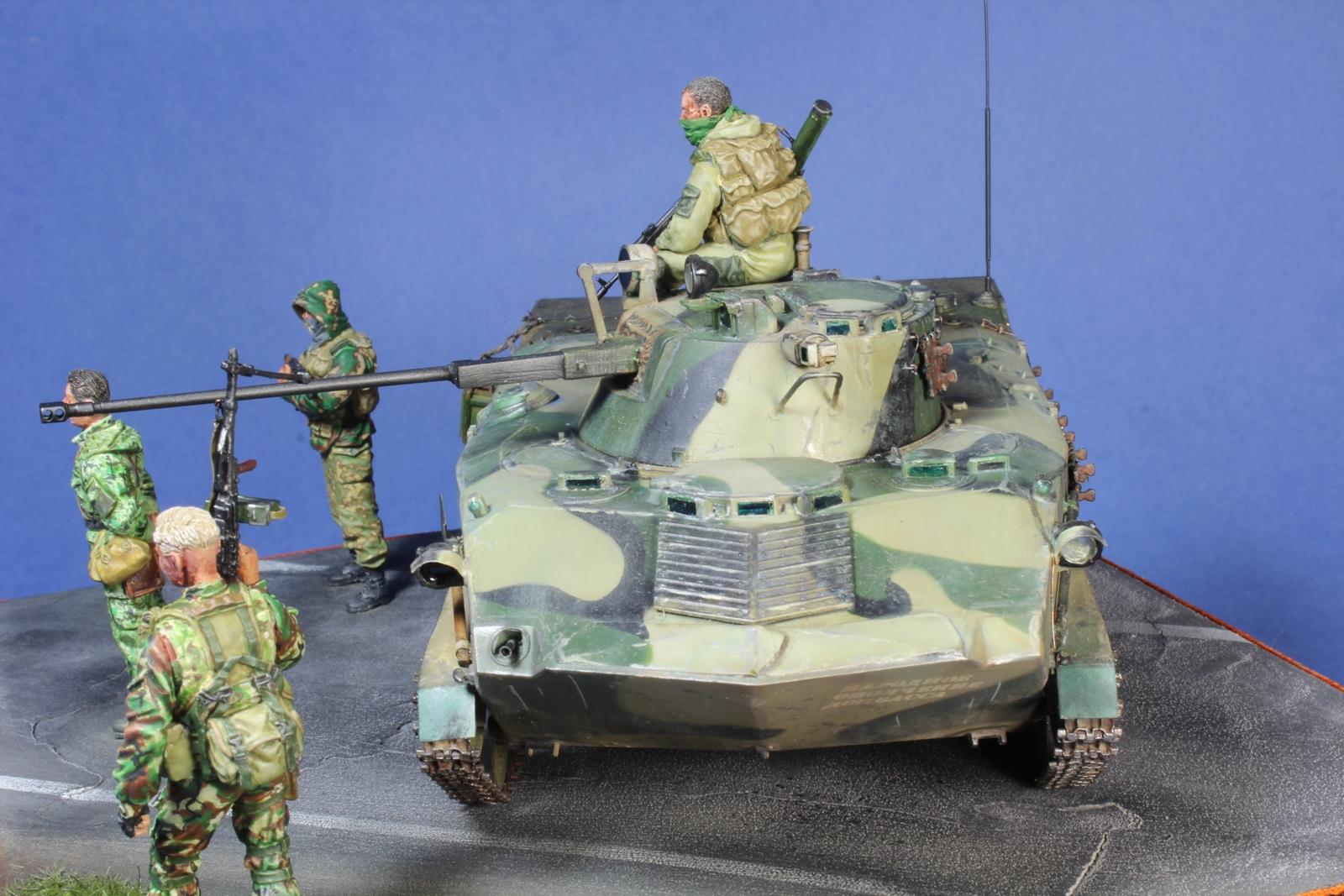 Понравилась роспись камуфляжа) У парня в капюшоне здорово выгорели штаны. Вот только у автоматчика на люке БМД(шки) бандана на лице какая то слишком яркая. В натуре она блеклая серо-зеленого цвета. А так работа симпатичная