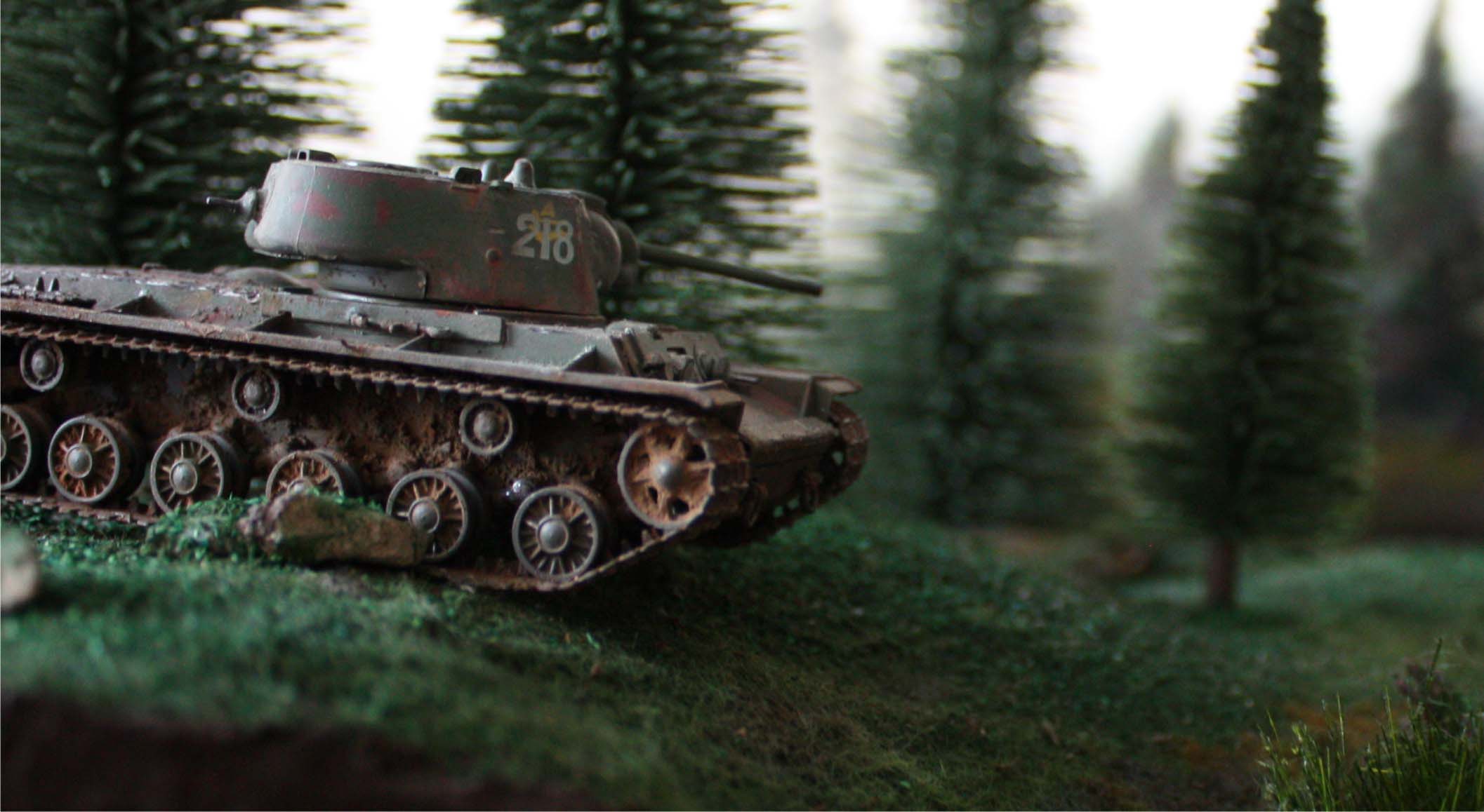 Катки тигра к сожалению не могут повторит рельефа местности, т.к. эта "замечательная" моель от фирмы "Звезда" сделала ходовую часть двумя целиковыми отлитыми детальками)), а КВ-1 стоит на достаточно ровной поверхности. По поводу цвета он конечно не дункельгельб, а скорее танковый серый, который я наверное слишком сильно покрыл слоем светлой пыли. Спасибо большо за коментарии как по технике изготовления, так и по сюжету