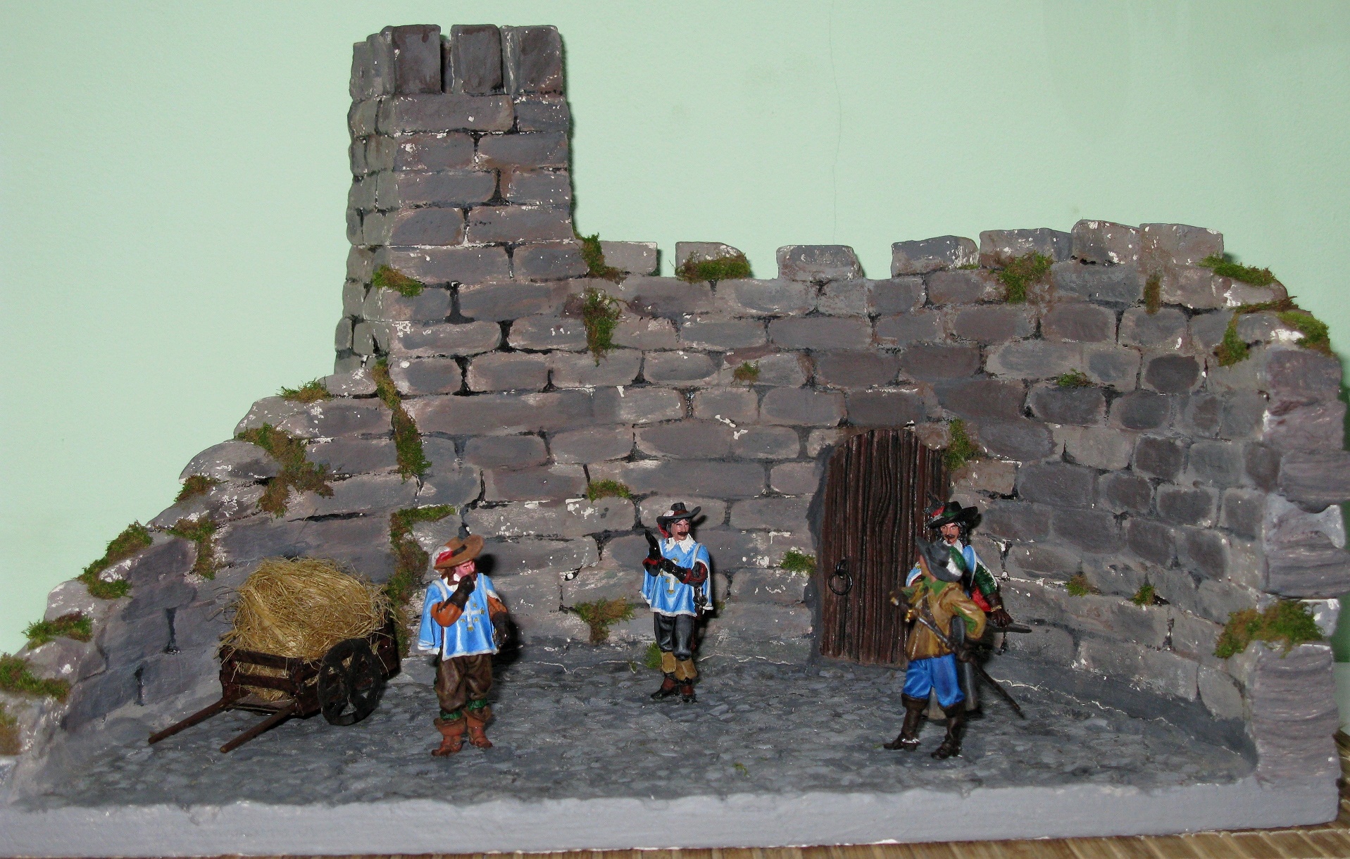 Вся диорама установлена на фанерной основе. Мостовая выполнена из глины для художественной лепки. Стены и башня монастыря сделаны из гипсокартона порезанного на кирпичики и декорированы натуральным мхом. Не знаю долго ли продержится - сухой мох показал себя не самым надежным материалом. Телега - спичечный коробок, 8 фанерных щепок и 2 ватные палочки. Колеса вырезаны из плотного картона. Сено - пакля. Дверь тоже картонная. Покрашено все акрилом.