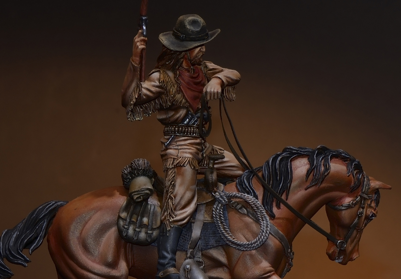 Я думал это ни кто иной, как Баффало Билл, он же Уильям Коуди. Знаменитый охотник на бизонов, создавший в последствии цирковое шоу "Дикий Запад". На мой взгляд имеется портретное сходство. Позы во время охоты на бизонов могли приниматься самые разные. Смотрели "Танцующий с волками"? Там сцена такой охоты отлично показана. Например в тесноте и давке лошадь могла бежать вплотную с бизоном и всадник, чтобы не повредить ногу вполне мог подтянуть ее к седлу.