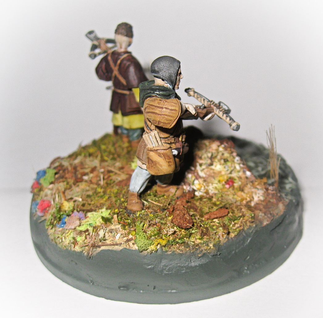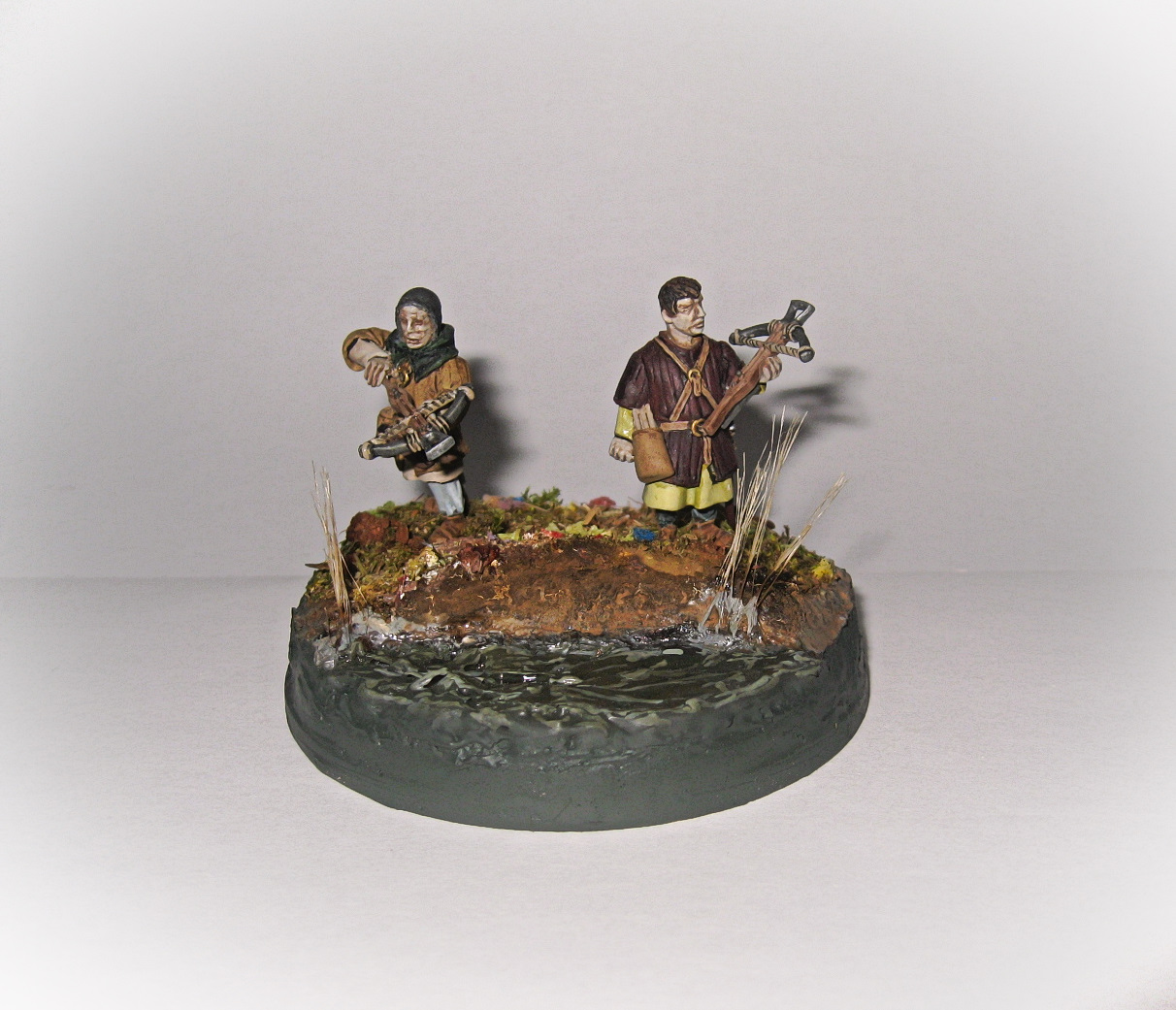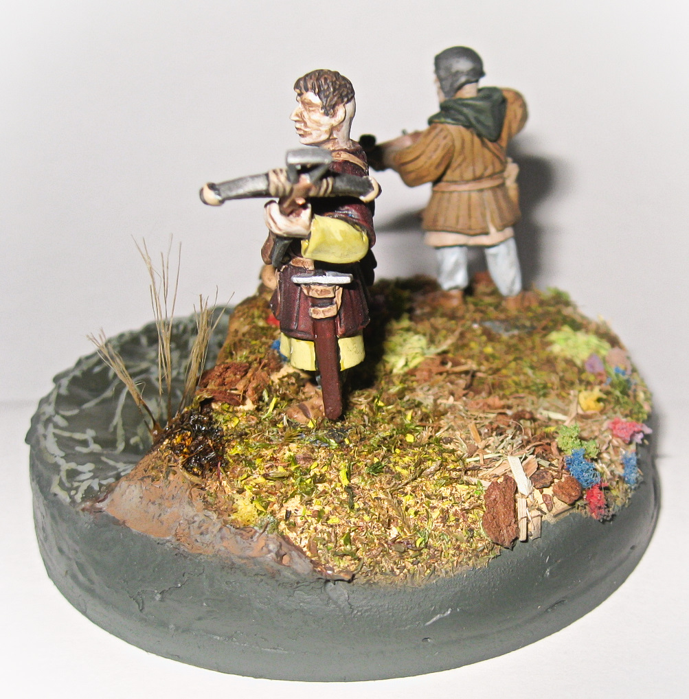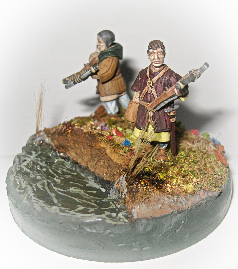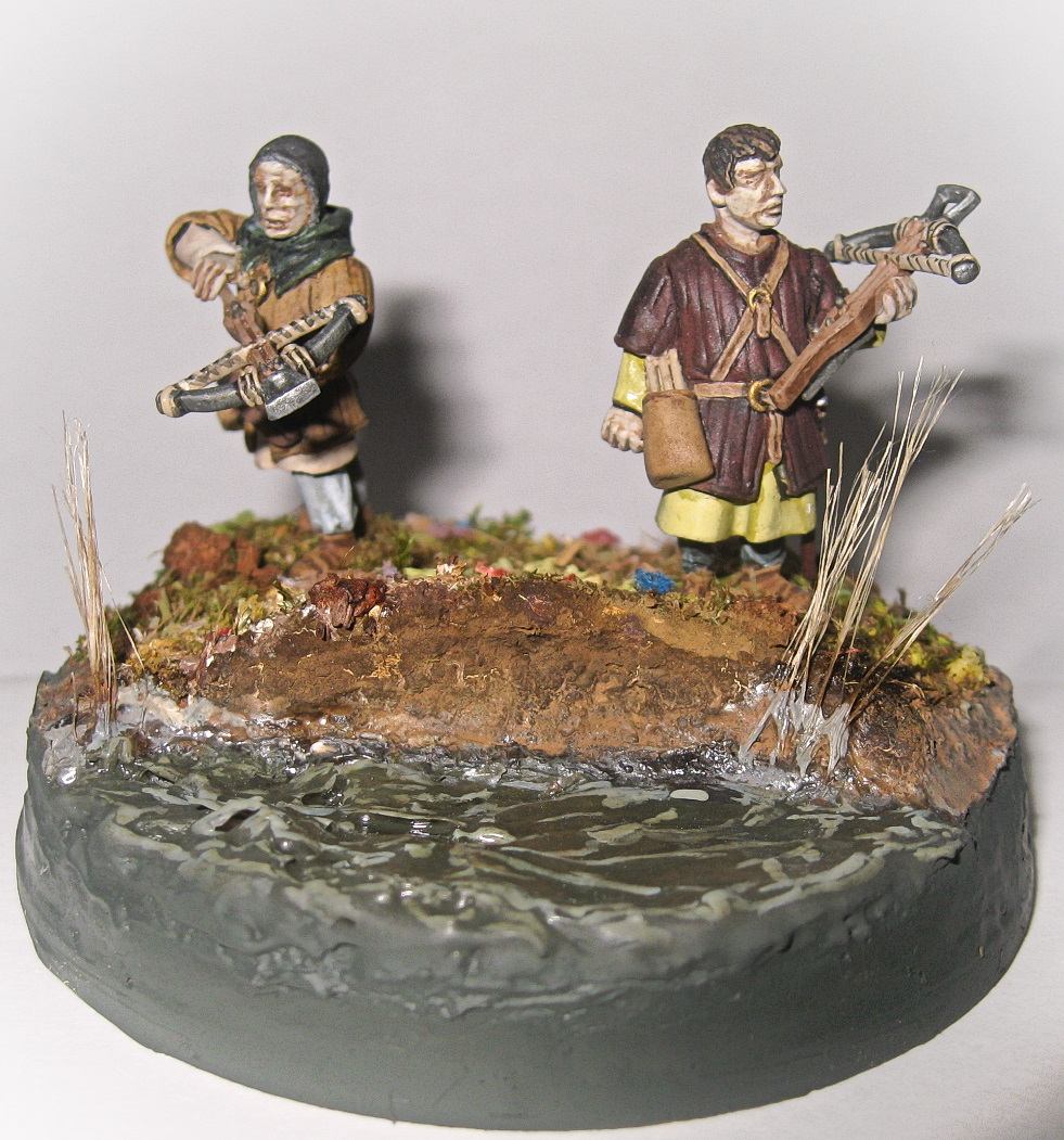Вот такая вот виньетка. Использованы два арбалетчика из набора "Драбанта". Воду делал первый раз. Использовал жидкое стекло, но результатом не особенно доволен, пришлось водичку по разукрашивать в силу способностей.