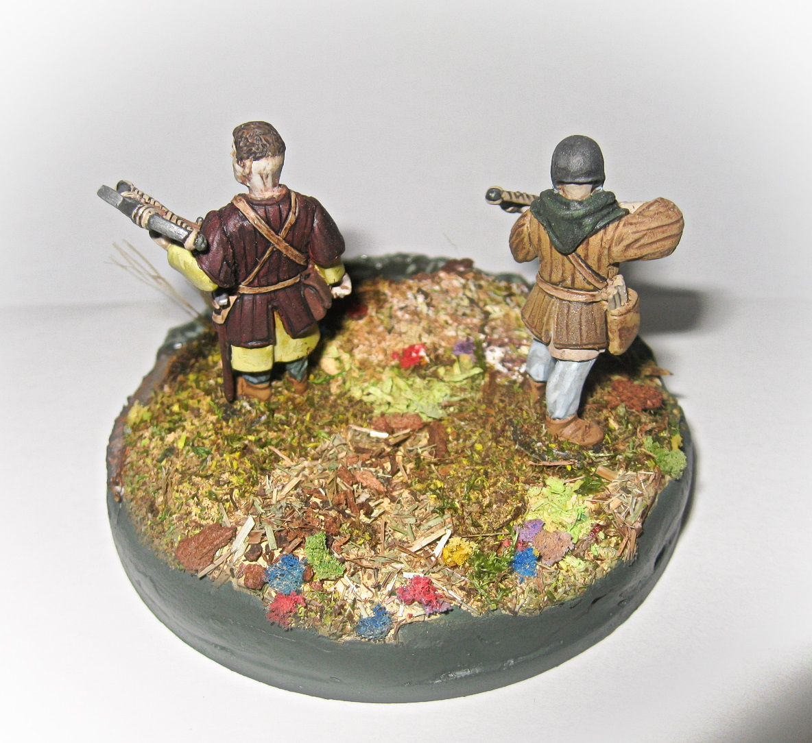 У вас точности более чем. Даже завидно. Надо переходить от заливок к лессировкам, даже на 28 мм. В сути окрас такого масштаба ничем особо не отличается от более крупных. Лен, лучше не приклеивать, а высверлить отверстие и вставлять в него пучок. Какие металлики вы используете?