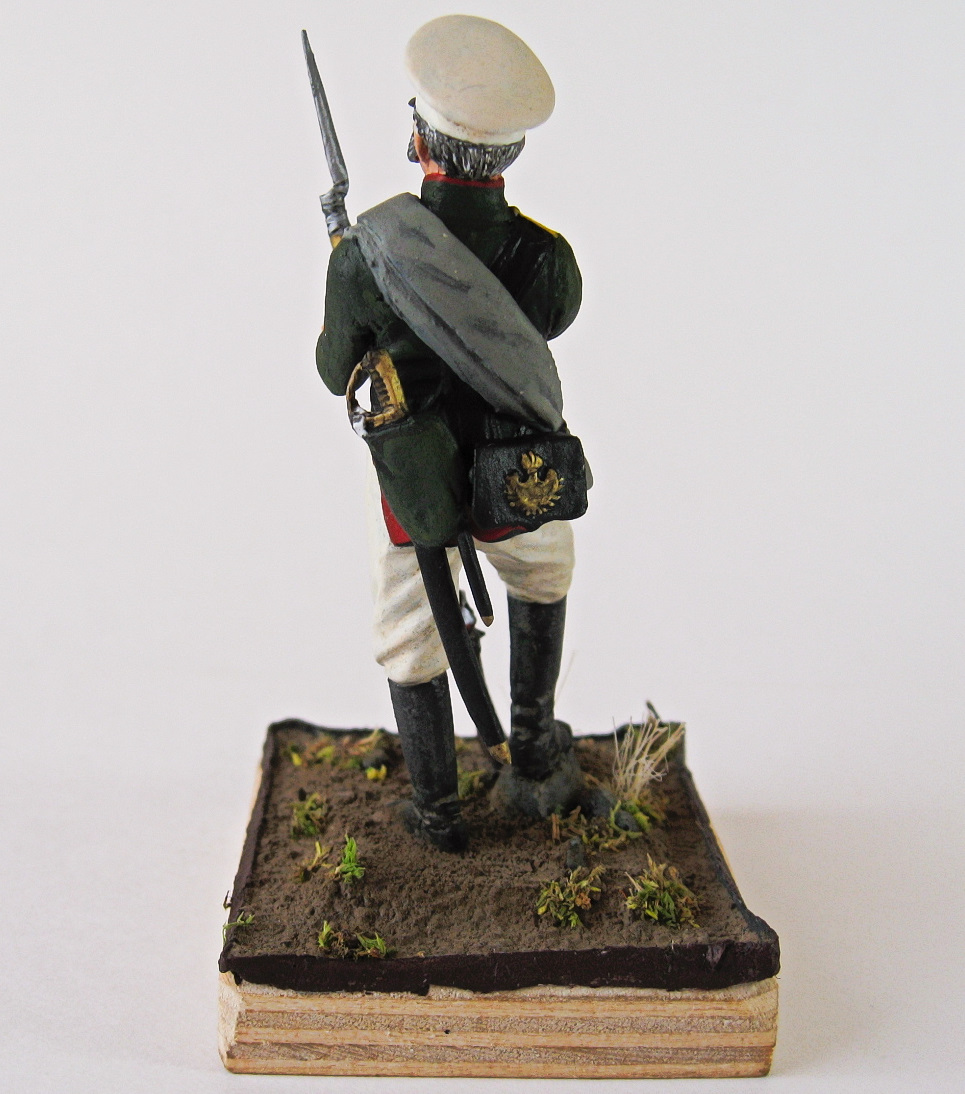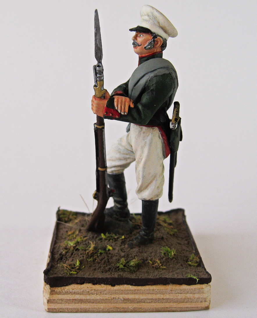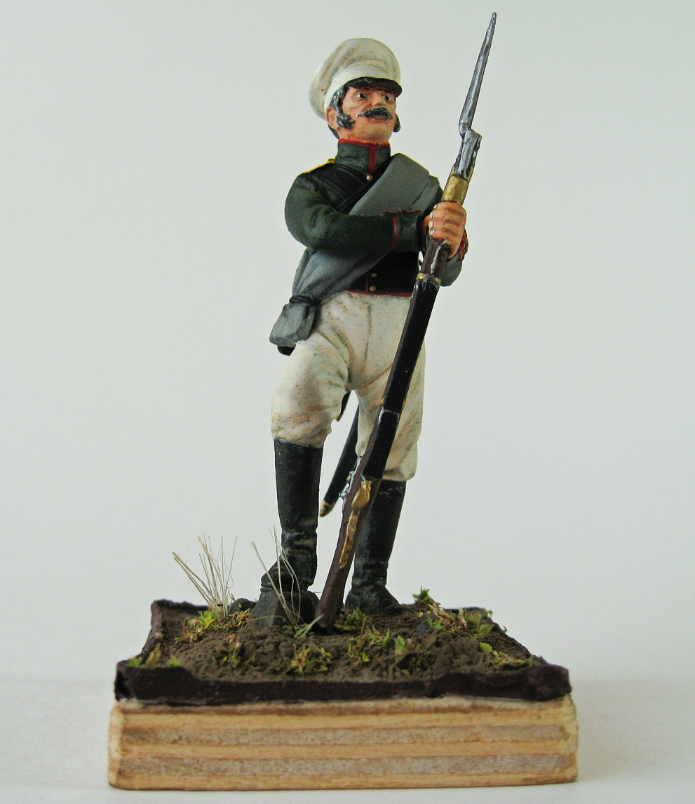 Представлен рядовой Эриванского карабинерного полка на 1830-е годы, форма для экспедиций. В октябре 1827 года, после отличие при взятии Эривани, 7-й карабинерный полк получил наименование Эриванского карабинерного. При общей карабинерной форме, полк имел шифровку на погонах в виде буквы Э с точкой.