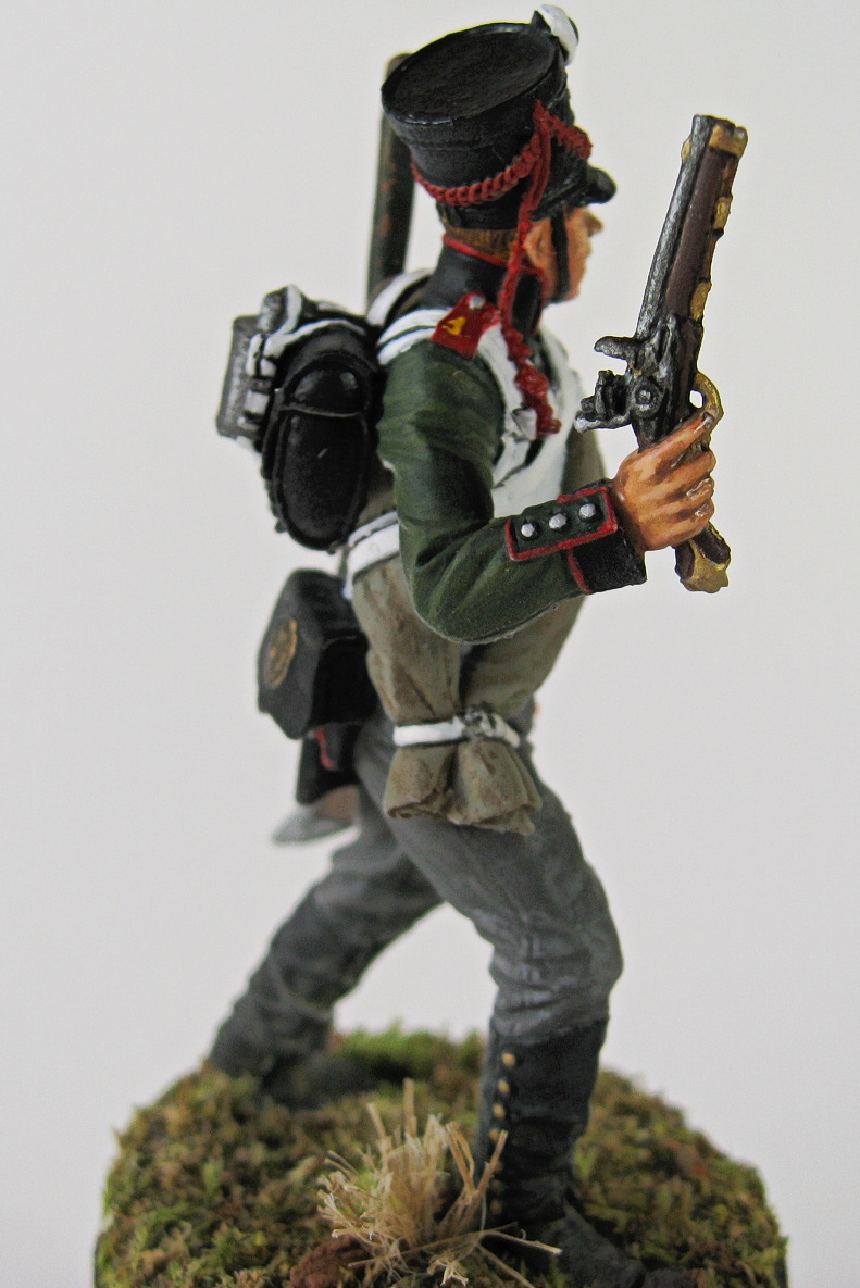 Ну для начала вот. Участки на штанах - высветления теней. Лак, видимых, белесых разводов не оставил. Относительно кивера - кожанные части лакировались или интенсивно вощились, поэтому кивер должен быль различен по структуре - сукно и кожа - различны. Сатиновый лак на лице - возможно, но на более крупном масштабе.