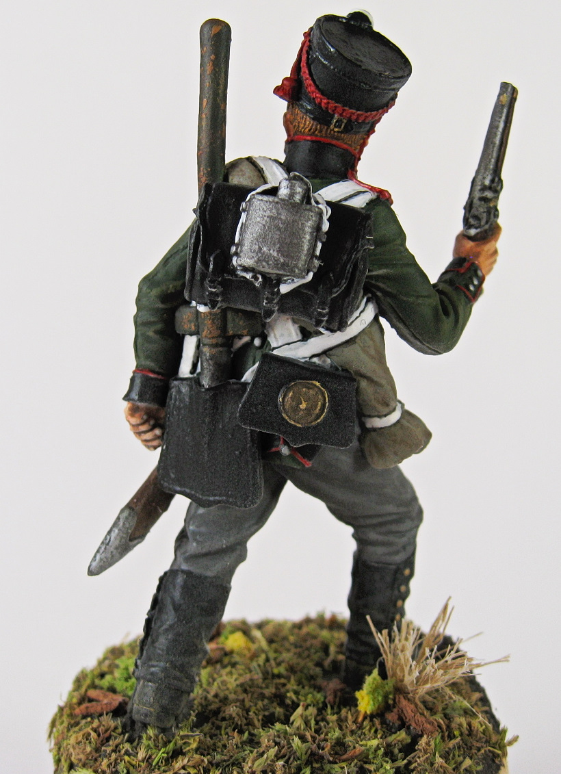 Миниатюра изображает пионера 3-й пионерной роты, 1-о пионерного полка на период 1809-11 годов. Кампанию 1812, а также часть кампании 1813 годов, полк провел в этой же униформе. Относительно оранжевого (или огненного) цвета темляка - есть такое мнение в исторической среде. На некоторых точно датированных родных вещах, скорее оранжевый, нежели желтый. Поначалу, хотел сделать второй полк, однако отринул данную идею вследствие сложностей с рисованием цифры 2 на погоне (пистоль мешал, а мучится не хотелось).