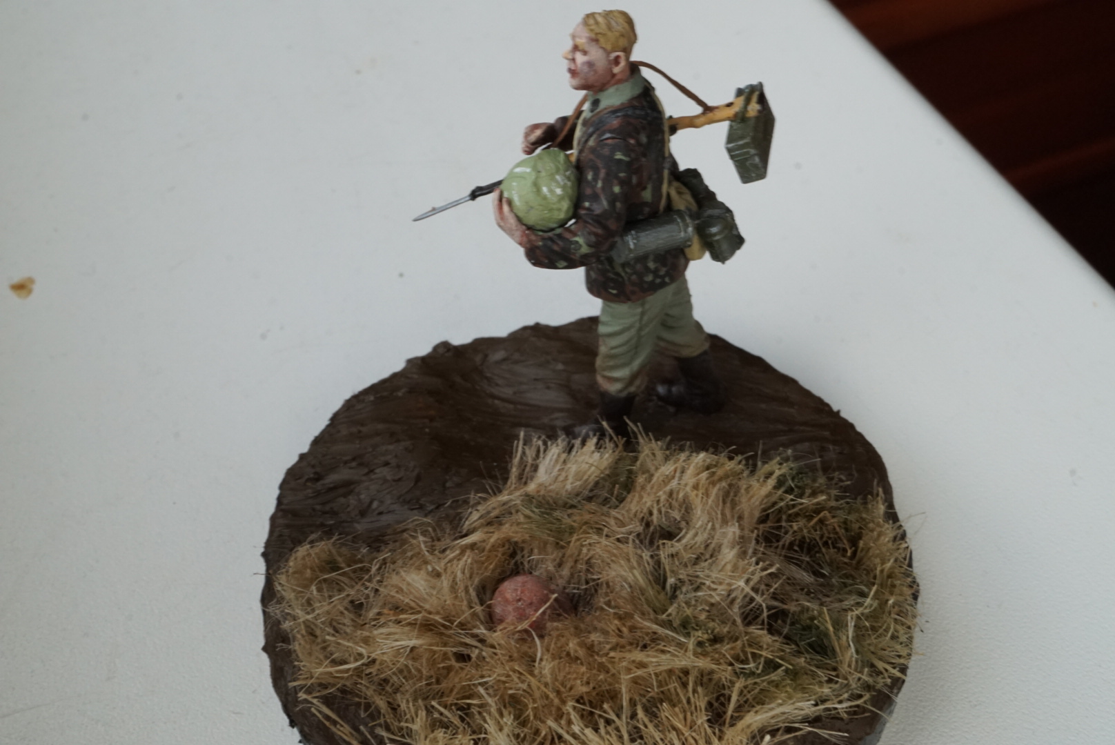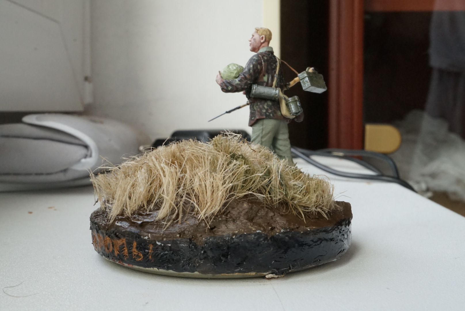 Фигурка - MasterBox, каска в траве - тоже. Основание самодельное, из гипса, трава - пакля, грязь - масляные краски. Фигурка окрашена в основном красками Lifecolor, фрагментарно Tamiya (металлическое снаряжение), лицо и руки - AK Interactive, каска окрашена красками и пигментами Lifecolor.