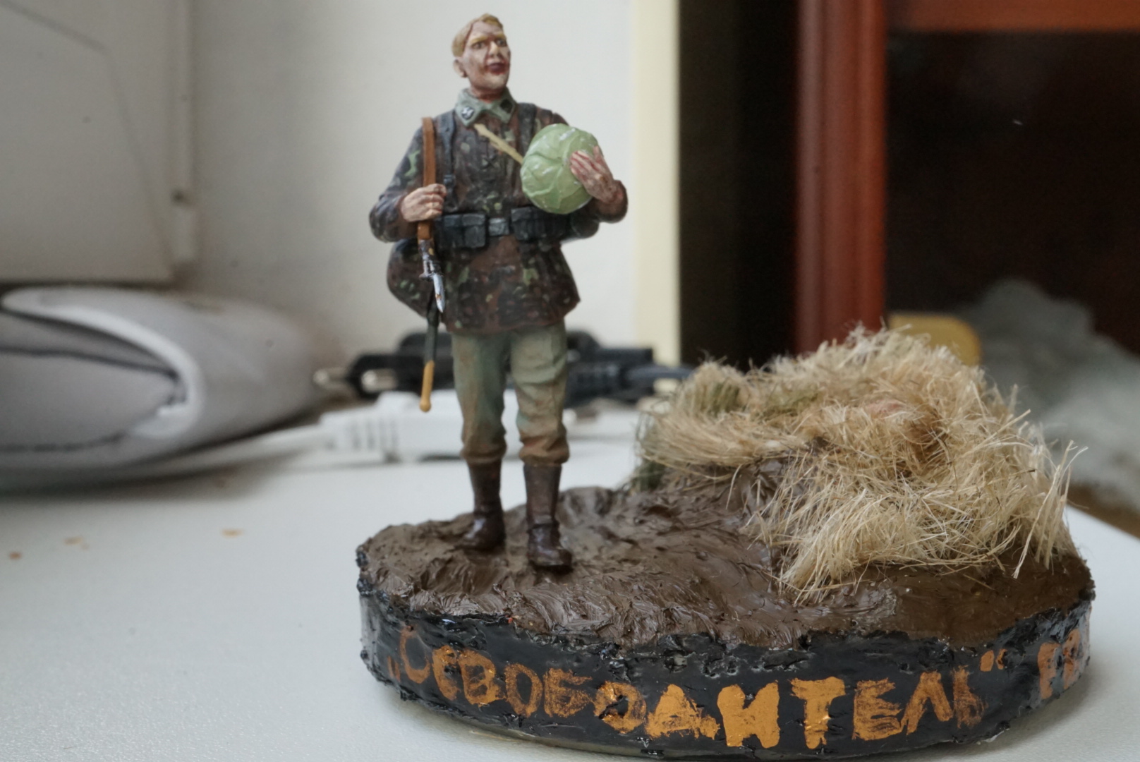 Молодец,что выставили работу,не стушевались.Сам помню,как с щенящей радостью показывал первые покрашенные фигурки друзьям,те крутили у виска-не их тема.Могу дать несколько советов на будущее.Любую работу встречают по одежке,поэтому выбирайте основание для солдатика поменьше,но делайте аккуратней.Всякие камуфляжи,узоры и"шотландки"оставьте на потом,когда руку набьете.Немецкий камуфляж смотрится эффектно,когда он правильно и масштабно прорисован.Как расписывать лица,посмотрите на сайте(статей много).Вместо грязи сажайте больше травки разных оттенков и сухих пигментов.Классно получился качан капусты,но надо пролить темными смывками,чтобы листы дали рельеф.Дальнейших успехов!