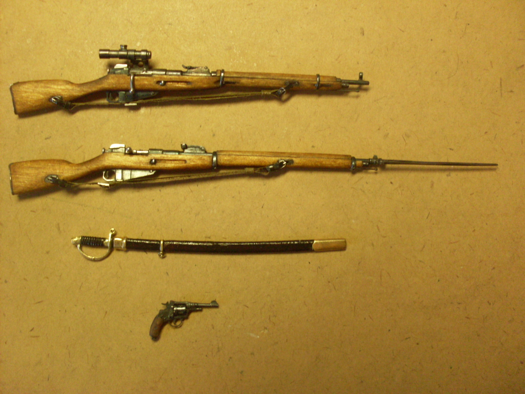 Винтовки:Мосина пехотная образца 1891 1910 года и снайперская образца 1891 1930 года.Револьвер системы Нагана образца 1895 года.Шашка драгунская офицерская образца 1881 1909 года .Материал:железо дерево латунь .Масштаб 1:16 Самодел ручная работа.