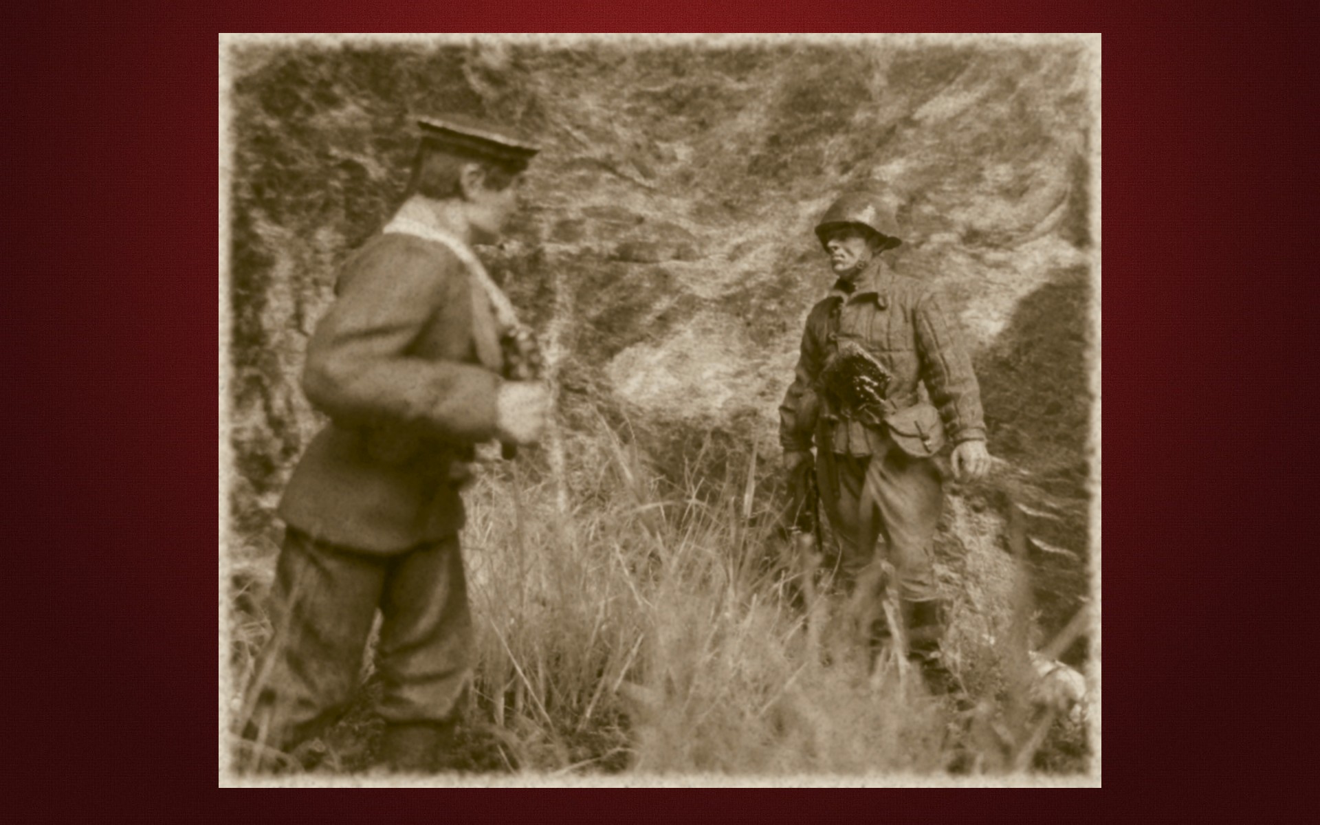 Смотрите мой видеоролик. Виньетка изображает бойцов Красной армии и флота осенью 1942 года в Сталинграде. Фигурки 54 мм. Окраска красками Revell mat и маслом. Растительность натуральная. В видеоролике звучит песня От героев былых времен.