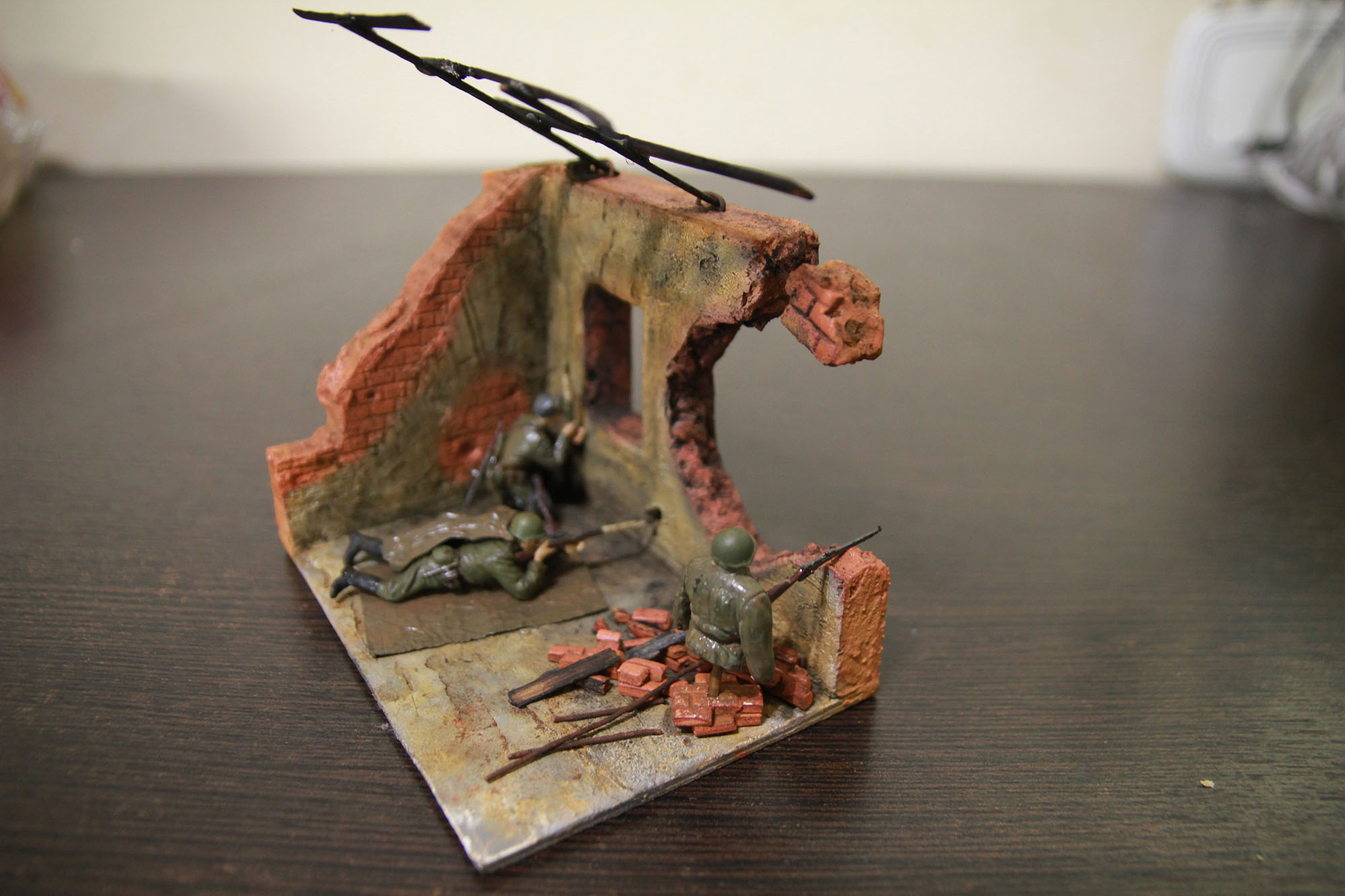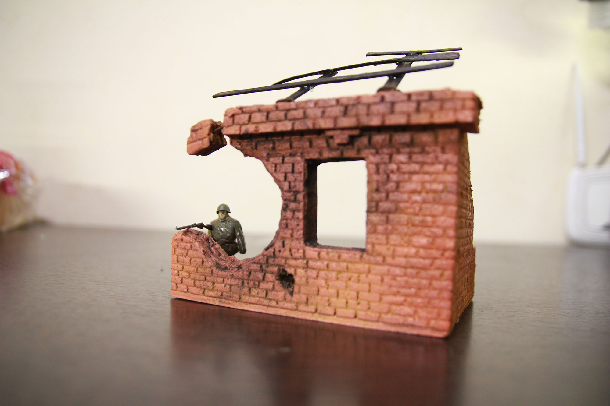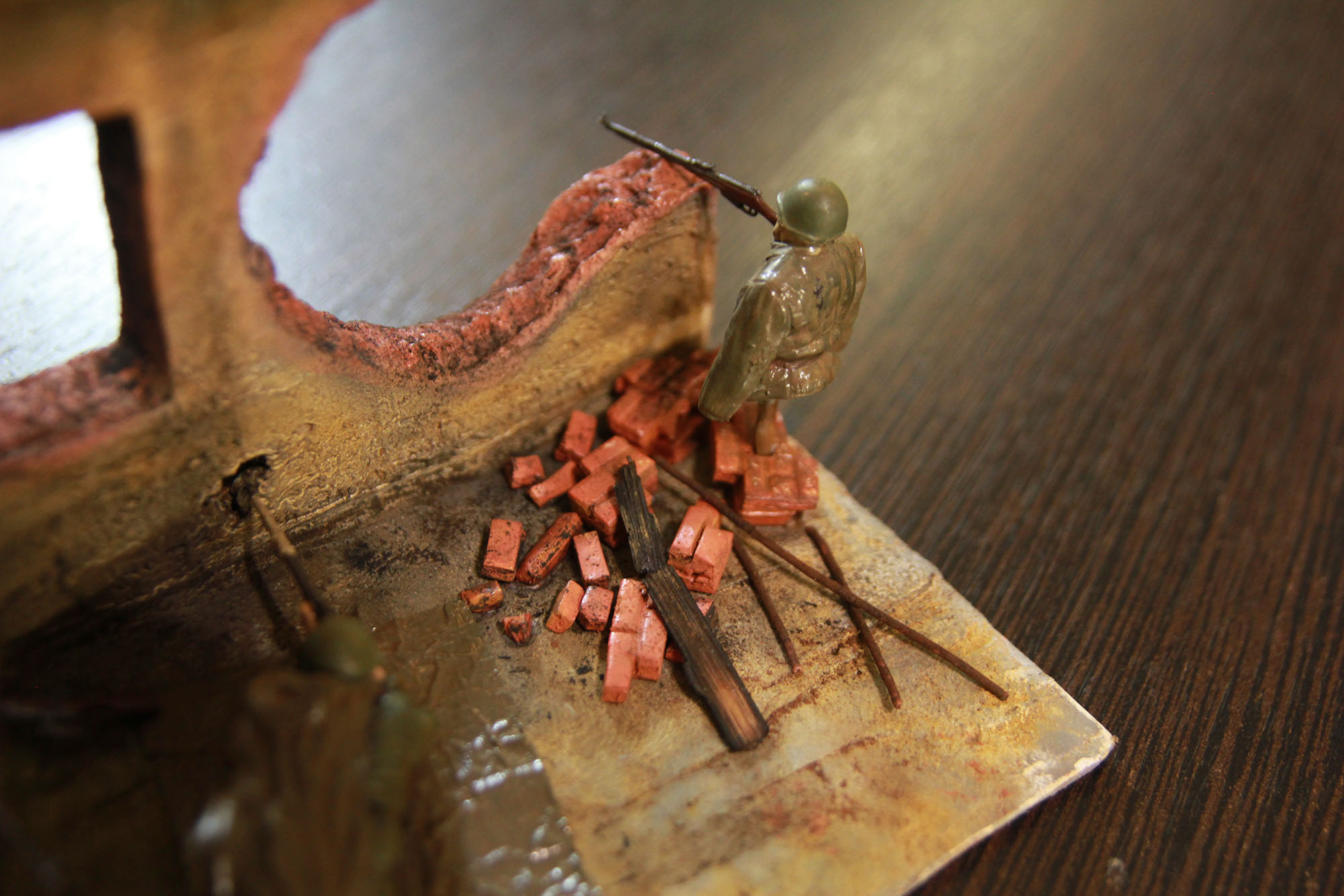 Кирпичи вырезал из пластика, покрасил их в цвет кладки и засыпал сажей.
