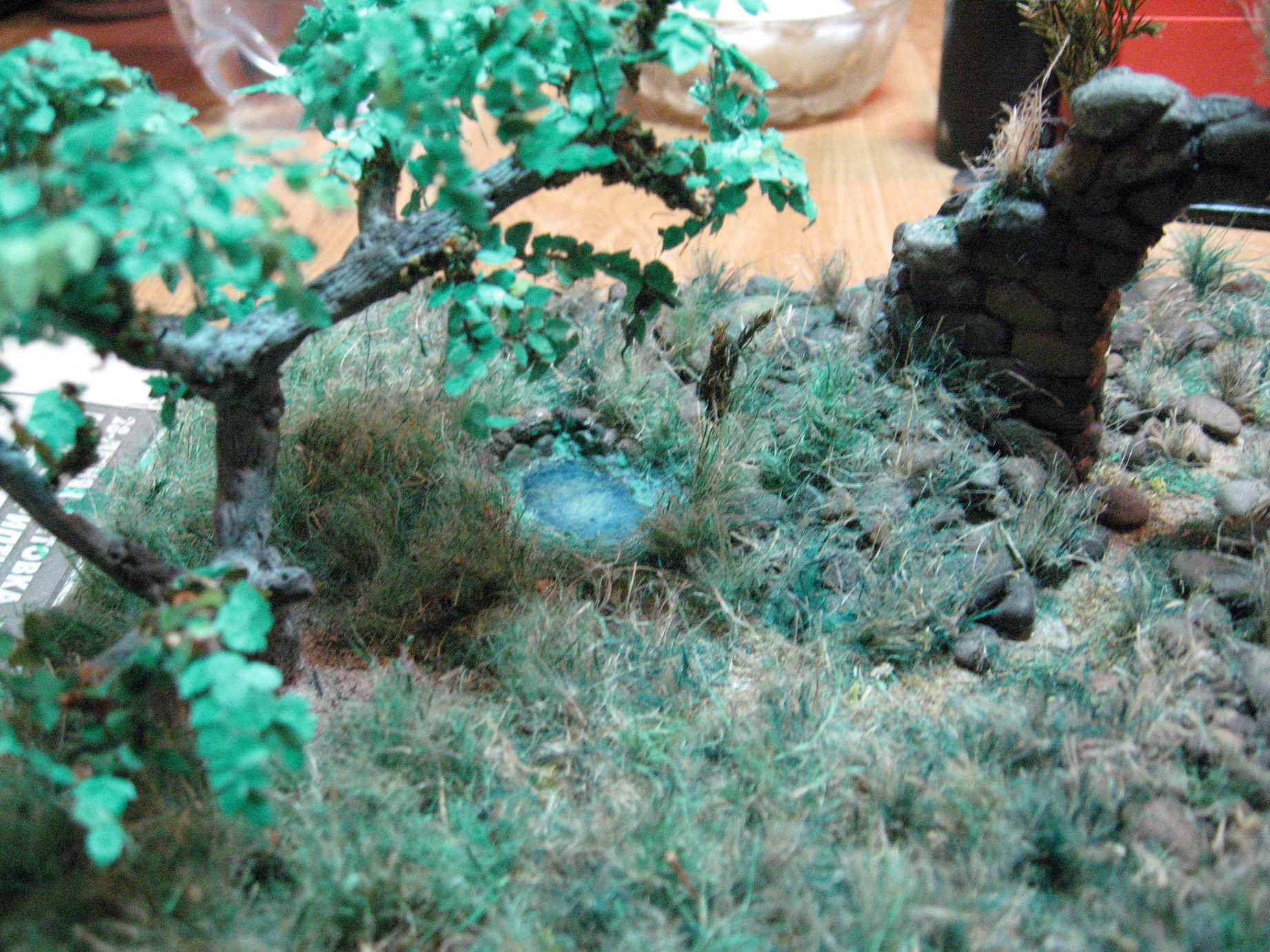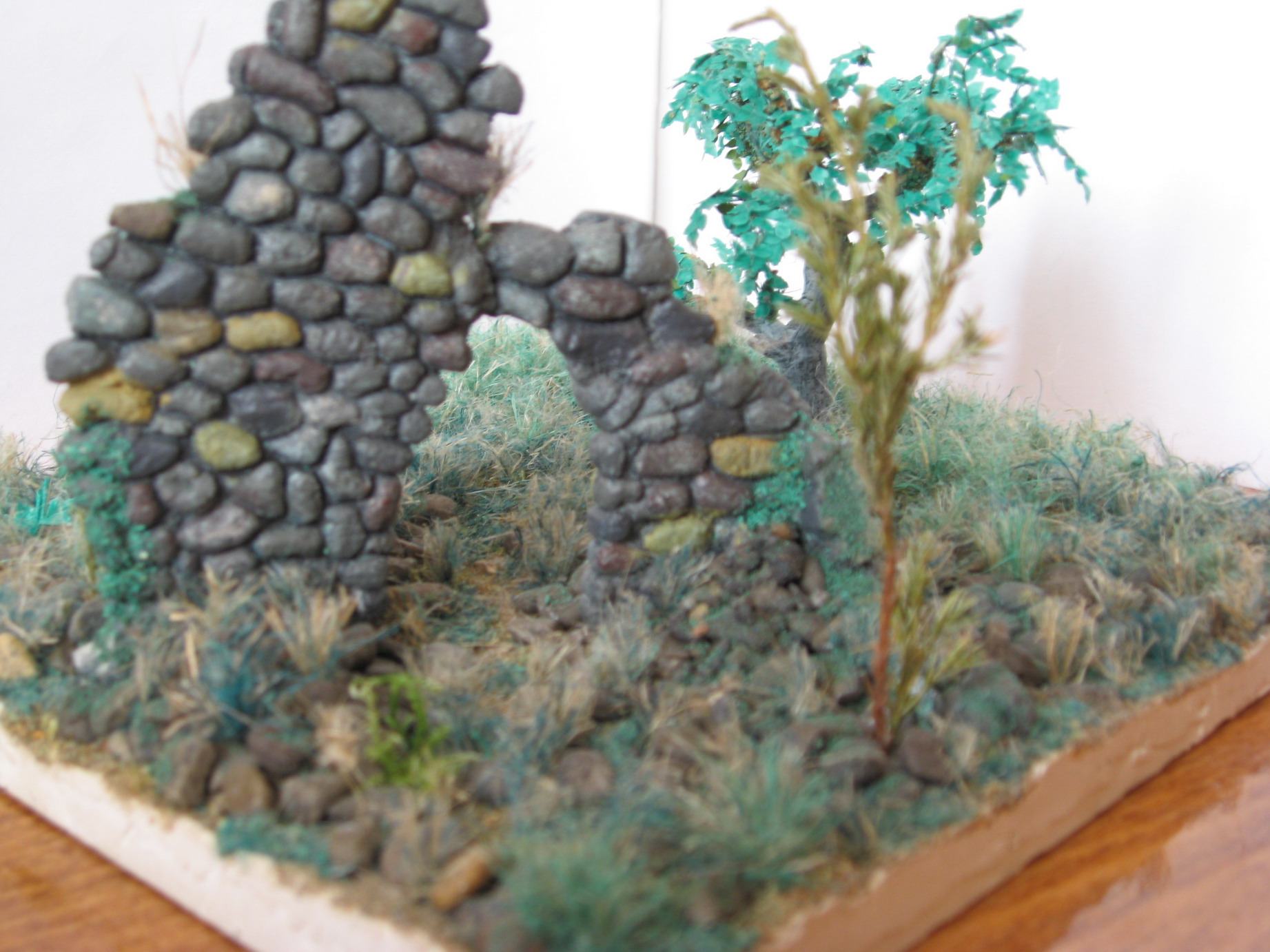 Всем привет!Моя винетка готова на 80%!Так как Это первая работа,хочу услышать ваше мнение о ней,Основание-гипс,трава-пакля,развалины-гипсова форма,обработаная и тонированая,дерево-проволочный каркас,шпаклевка,листья-калька.Окрашено художественным акрилом,развалины-эмалью!