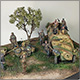 Фигурки использованы от фирмы Stalingrad, Alpine и Миниарт. Фигурки от Миниарт допиливал и доделывал под сюжет. В наборах от Alpine шло по два комплекта голов. Второй комплект как раз пригодился под фигурки от Миниарт. Также добавил некоторые травленые элементы (производителя не помню), такие, как пряжки ремней и знаки различия. Расписывал красками от АК и Валехо.